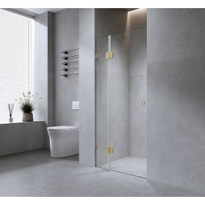 110cm Wall to Wall Frameless Shower Screen with White Brackets and Brass Hinges, Square Knob Handle