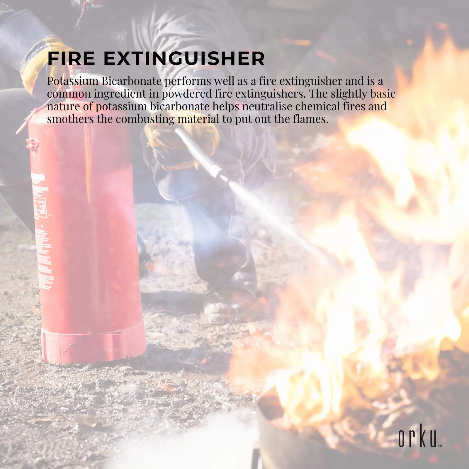 Potassium Bicarbonate performs well as a fire extinguisher and is a common ingredient in powdered fire extinguishers. The slightly basic nature of potassium bicarbonate helps neutralise chemical fires and smothers the combusting material to put out the flames.
