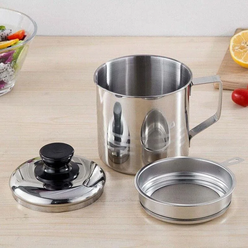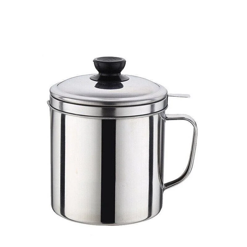 Keep your kitchen cleaner and your oil reusable with this 1.8L stainless steel oil filter pot. Designed for daily use, this oil strainer pot separates food residue from grease using a fine mesh filter, helping you store clean oil for repeated use. Crafted from durable 410 stainless steel, it resists rust and heat, while the wide-mouth spout makes pouring easy without spills. A removable lid and filter allow for convenient cleaning, and the dust-proof cover helps protect oil when stored. Ideal for filtering used frying oil, bacon grease, soup stock, and more.