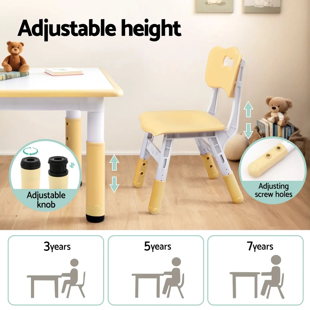 Make learning and playtime more fun with the Keezi Kids Table and 4 Chairs Set, a versatile and child-friendly addition to any playroom, classroom, or activity space. Designed with a draw-on tabletop, kids can unleash their creativity while enjoying arts, crafts, and learning activities. The height-adjustable design ensures the perfect fit as your child grows, while the non-toxic PP material and smooth rounded edges ensure its safe surface for everyday use.