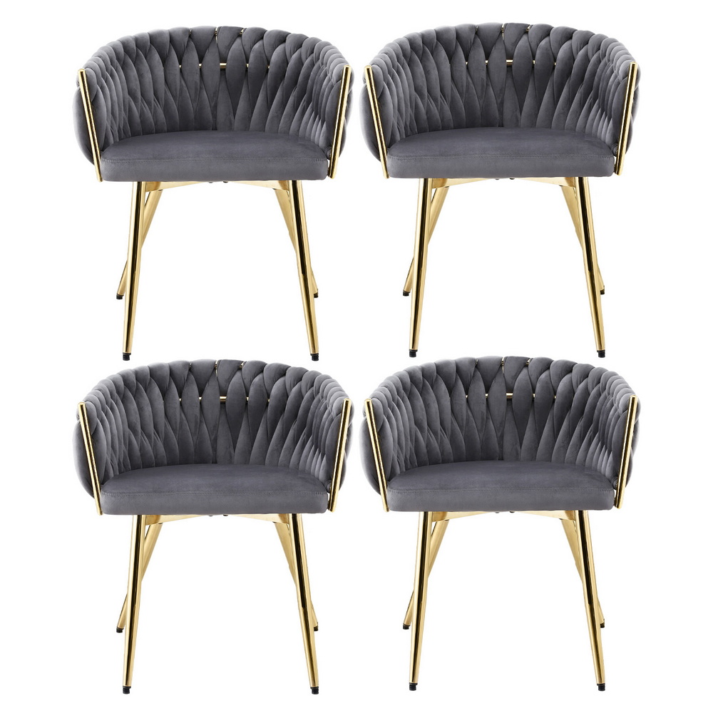 Wine, dine, and entertain guests with our meticulously designed Artiss dining chairs. They make a luxurious addition to any dining space and will make your guests envious of your gorgeous dining ambience. Not just for your dining room, these dining chairs are sure to make a statement in your study room, living room, and dressing room. Their versatility and ultra-modern design make them stand out. Incredibly stylish and sophisticated, our Artiss dining chairs feature inner solid wood construction with plush velvet upholstery and a hand-woven backrest that ensures lasting quality. It comes with solid steel legs with an anti-slip feet pad for ultimate stability and to keep your floors scratch-free. The dining chairs flaunt plush seats made with high-resilience foam that offer incredible comfort and support, and the cushioned back support with comfortable armrests allow you to dine with great comfort. Our dining chairs can hold up to 150kg weight, and their reinforced steel fixings make them super stable and reliable. Our Artiss dining chairs are certainly a big bang for your buck. Bring home this luxurious set of dining chairs without any hesitation. FeaturesSturdy steel legsPlush velvet upholsteryHand-woven backrestCushioned back supportHigh-resilience foamInner solid wood frameReinforced steel fixingsAnti-slip feet padEasy assembly150kg weight capacity*Note:The actual colour may vary due to differences in monitor colour depth and make.Specifications:Brand: ArtissSeat material: Soft velvet, PP cotton foamFrame material: MetalOverall dimensions: 63cm x 50cm x 69cmColour: GreyWeight capacity: 150kgAssembly required: YesNumber of packages: 4Package ContentArtiss Dining Chair X4Assembly manual X1This product comes with 1 year warranty