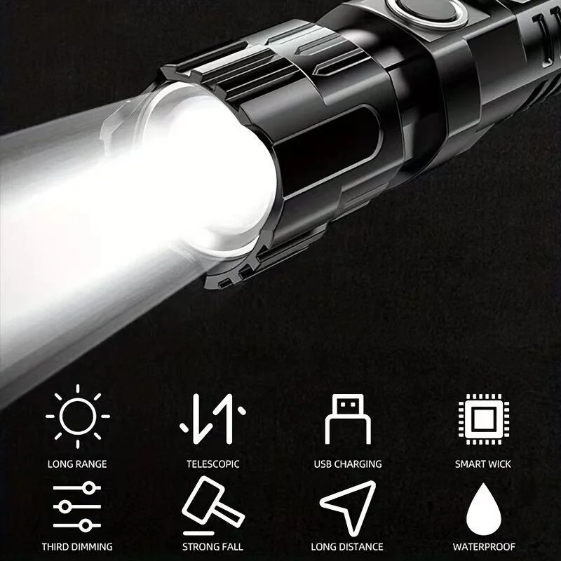 This multi-functional flashlight integrates high brightness, telescopic zoom and USB charging. It is suitable for daily home use and can also be a reliable companion for camping, hiking and exploration, providing safety guarantee for every outdoor adventure of yours.