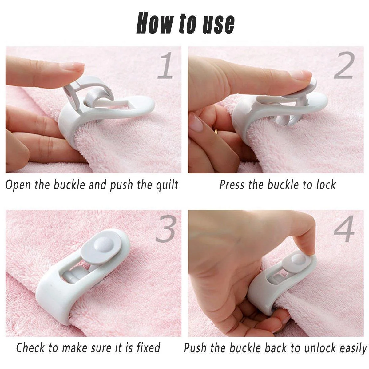 Easy to Use: Simply open the buckle, place the clip on the quilt, press to lock, and push back to unlock easily.