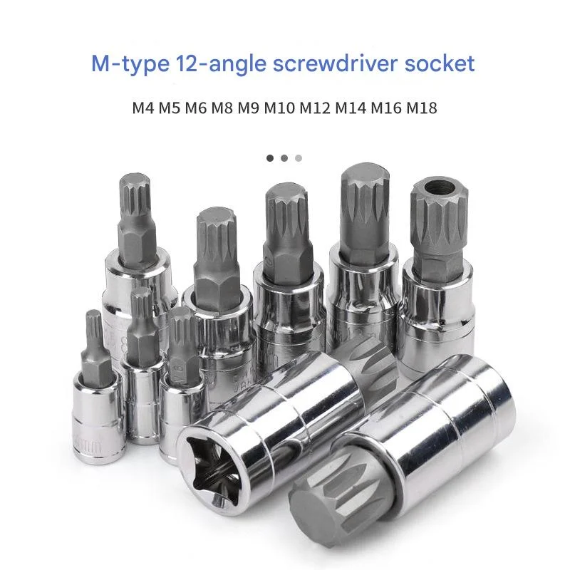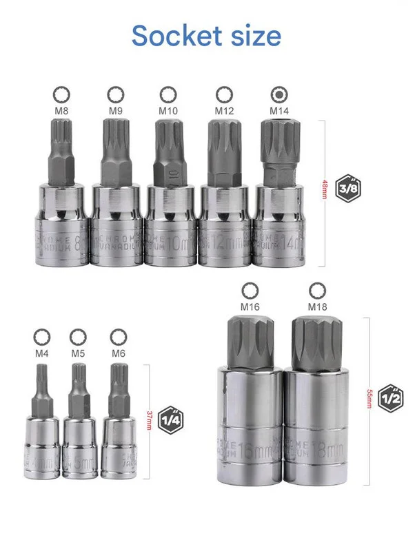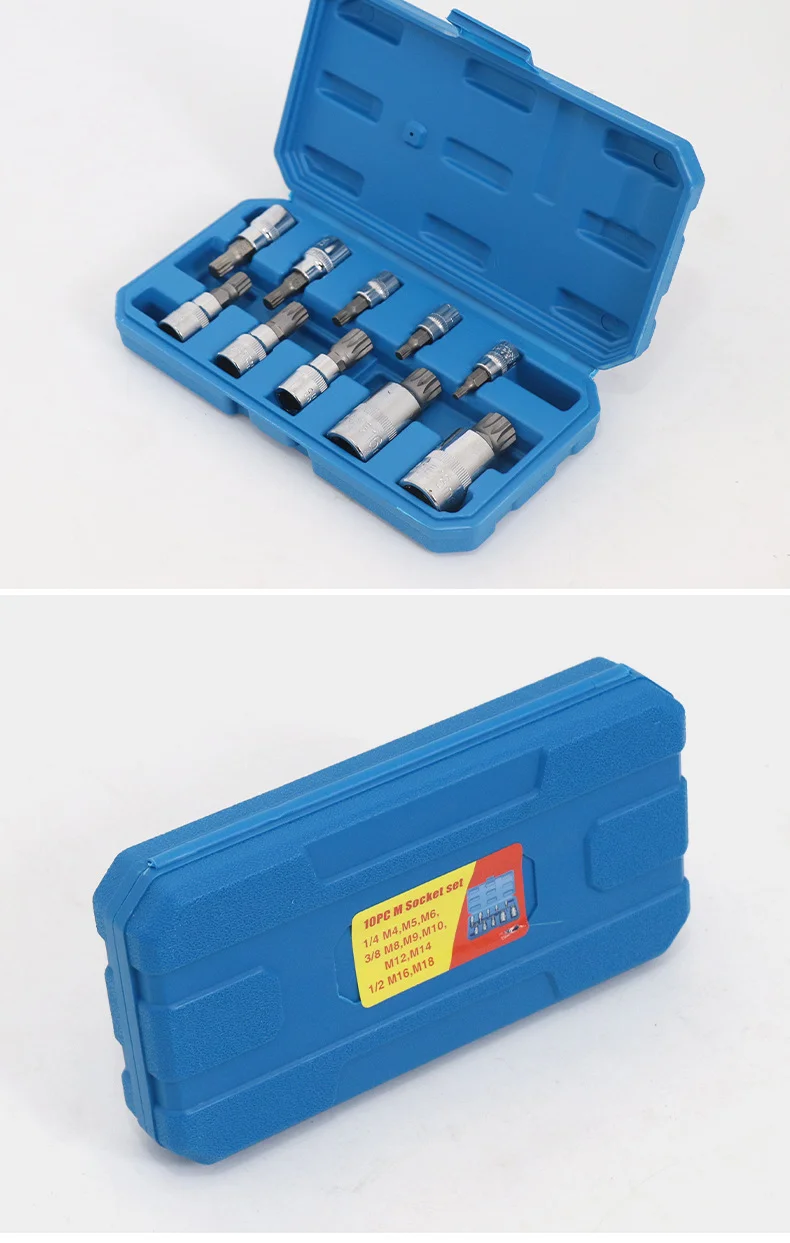 Equip your toolbox with this essential 10-Piece M-Type Spline Bit Socket Set, designed for precision and durability. Crafted from high-quality chrome steel material, each bit undergoes a rigorous quenching treatment and polishing electroplating for superior hardness, wear resistance, and a long lifespan. These sockets are engineered for robust performance, resisting fracture even under demanding use. The set includes a comprehensive range of M-type spline sizes (M4-M18) across 1/4 inch, 3/8 inch, and 1/2 inch drive sizes, making it versatile for a wide array of automotive, mechanical, and industrial applications. Presented in a sturdy, blow-molded case, the sockets are securely held in dedicated slots, preventing loss and offering excellent shock absorption and drop resistance. This convenient and portable set is perfect for professionals and DIY enthusiasts alike, ensuring easy organization and readiness for any task.