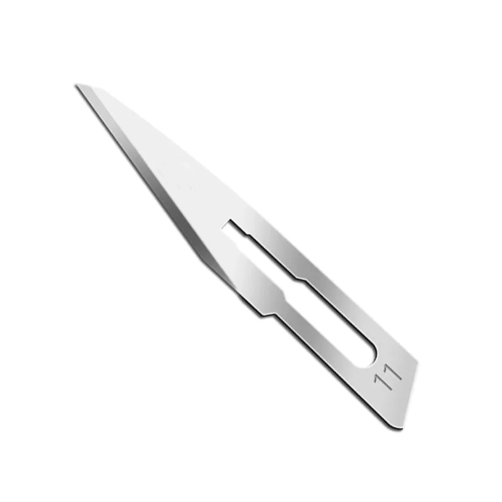 Medsure Surgical Blades Size 11 come in a box of 100 and are made of extremely sharp carbon steel, sterilised by gamma radiation 2.5 M Rads. They are to be used with a scalpel handle size No.3. To ensure sterility, the box of blades features a red spot sticker that stays red when sterile.