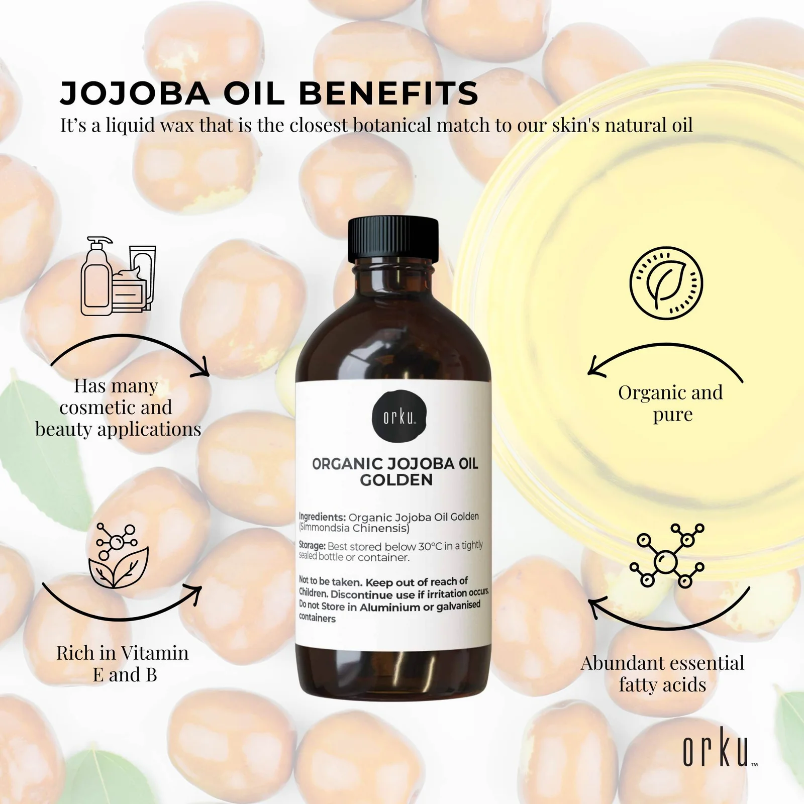 Jojoba Oil (pronounced ho-ho-ba) is a liquid wax that is similar to sebum naturally produced by skin. Loaded with crucial components such as Vitamin E & B, antioxidants and essential fatty acids, it may help repair skin cells while providing intense hydration and prolonged moisture.