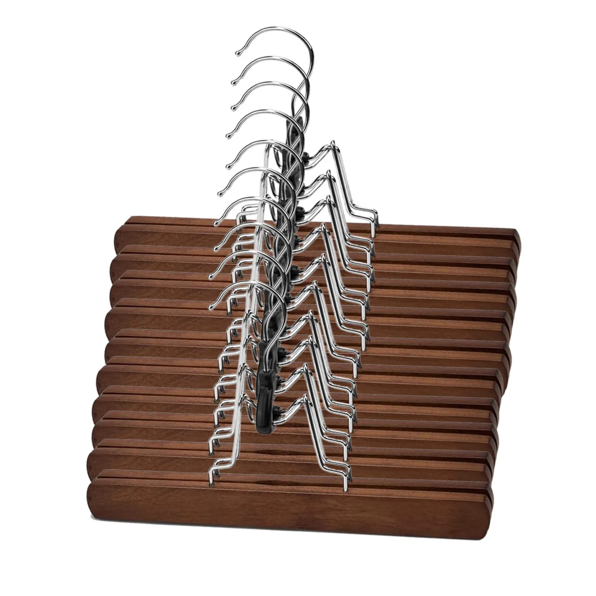 Crafted from durable solid wood with a smooth finish, these garment hangers offer sturdy and elegant support for skirts, trousers, and delicate clothing items. Each clip features a flannelette lining to prevent wrinkles and provide secure grip without damaging fabrics. With 360-degree rotatable hooks, these hangers allow flexible positioning in wardrobes, closets, or boutique racks. Available in light and dark brown, they blend seamlessly with various interior styles.