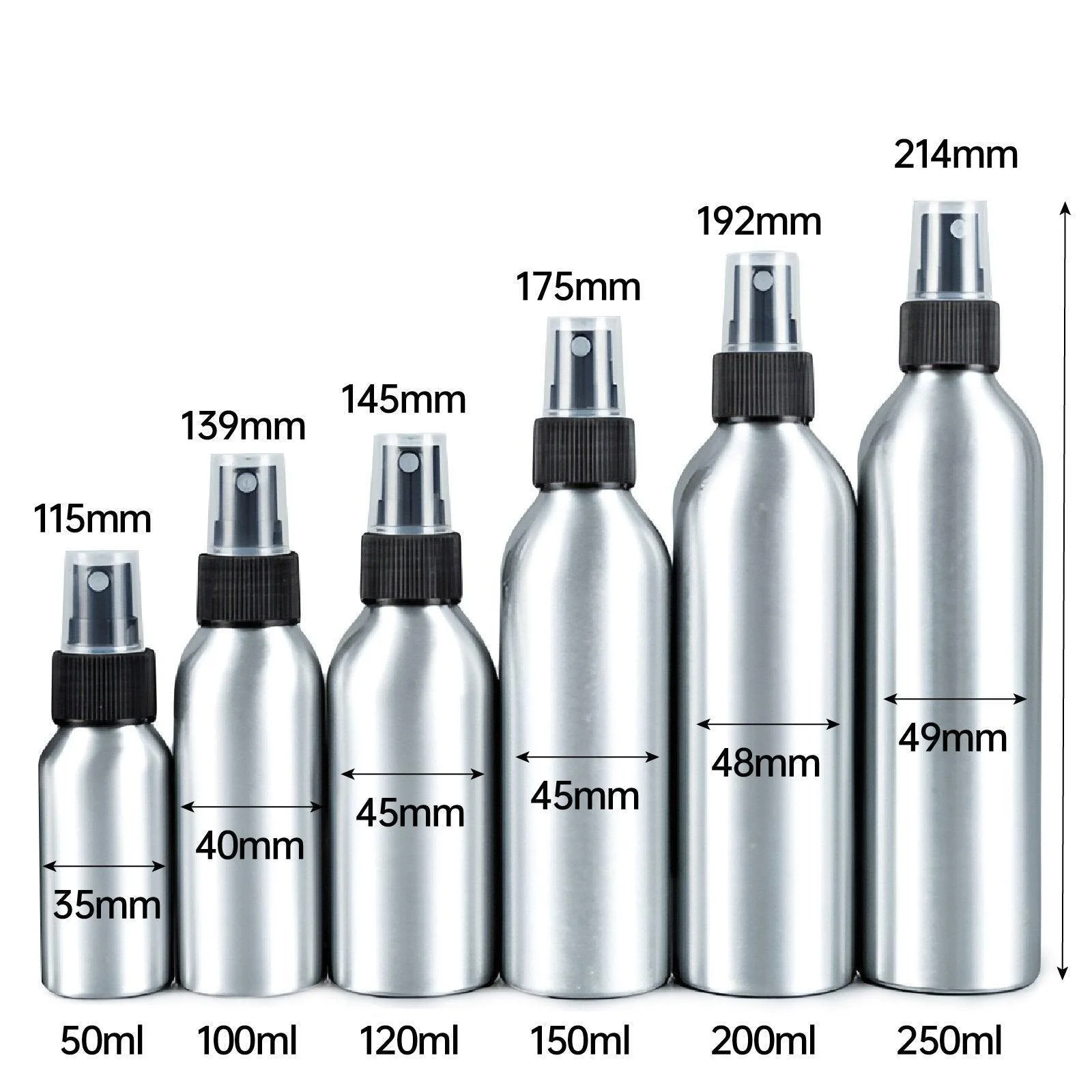- 120ml: 145mm height, 45mm diameter