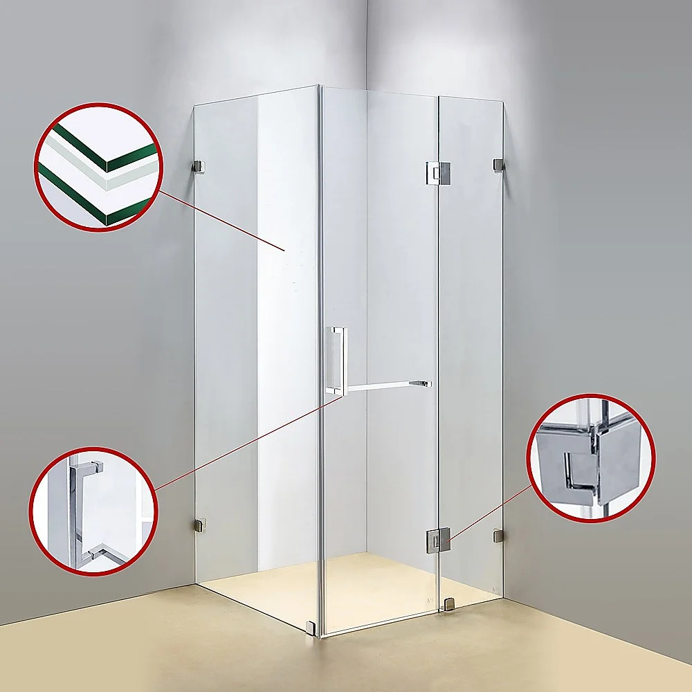 90x90cm Double Door Corner Shower Screen – Chrome Wall U-Brackets, SS Hinges & Square double pull Handle
