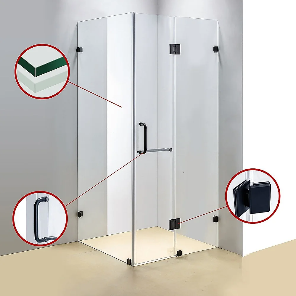 100x70cm Corner Frameless Shower Screen with Gunmetal U-Brackets and Floor U-Bracket and SS Hinges, Square Knob Handle