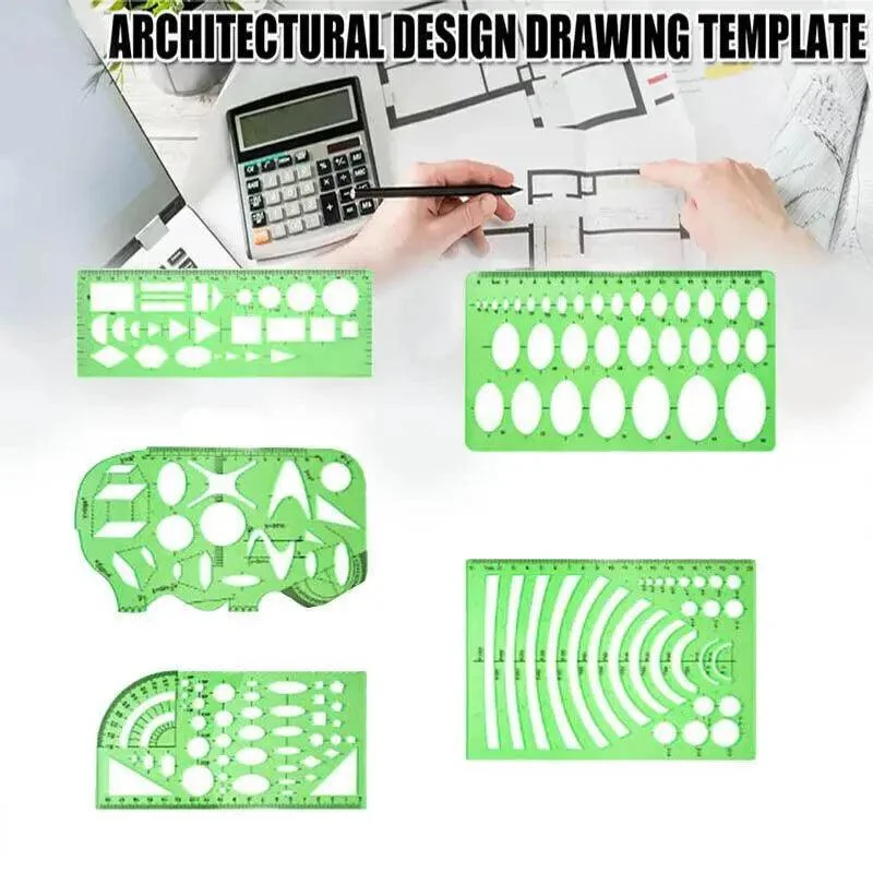 This is a set of 11 pieces of clear green plastic geometry ruler set. Geometric stencils are great for art design, nut design, mechanical engineering, architecture, network technique, fractional measurement, and drawing templates in school and office.