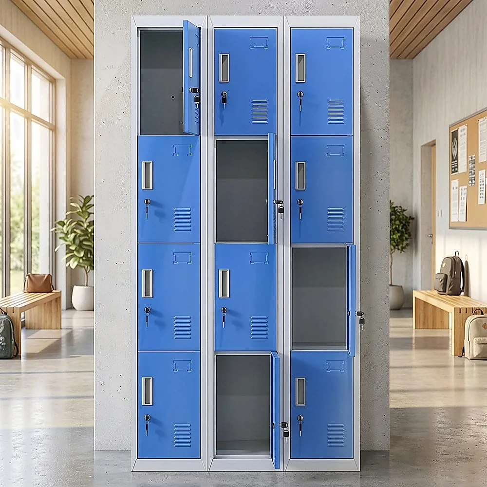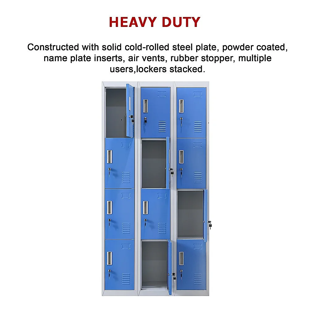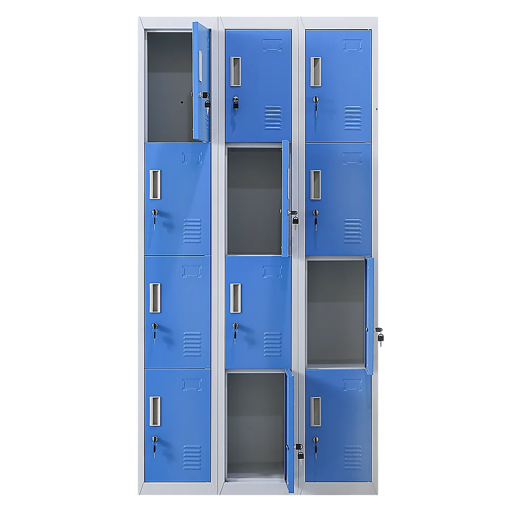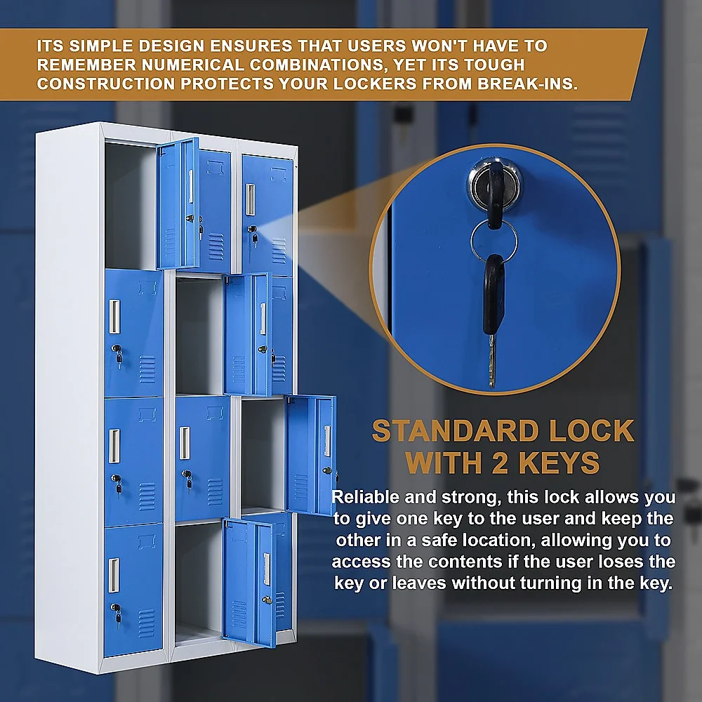 The unit has 12 individual locker compartments stacked in a 3 x 4 grid. Each locker provides ample space for personal items and can hold up to 30 kg. Built-in ventilations slits keep the stored items from smelling musty. Users may also customise their locker with a name tag or label in the designated slot provided. This comes comes with standard locks (with 2 keys each) to ensure safety of your belongings.