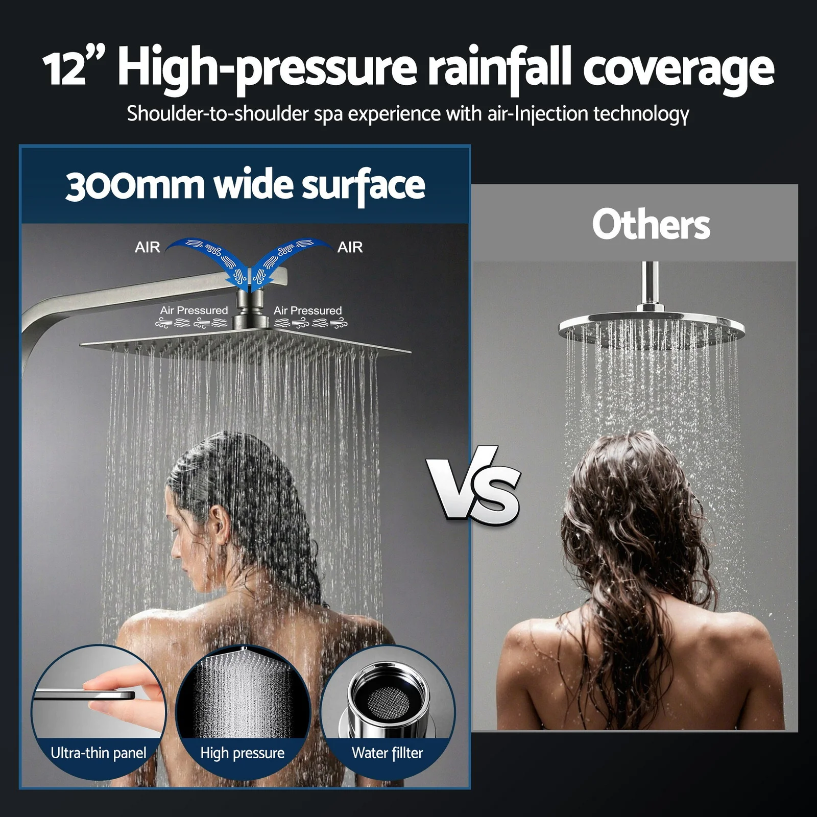 Overhead shower head size: 300 x 300mm