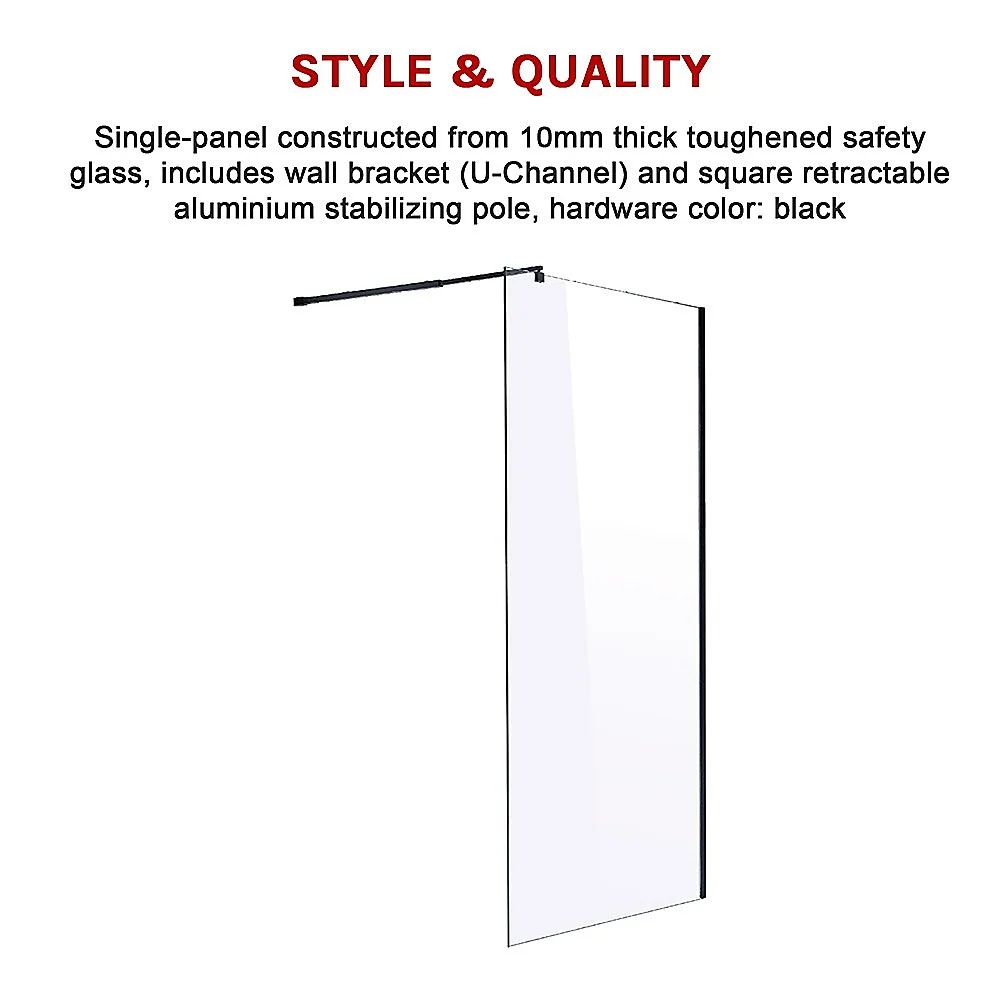 This single-panel screen is crafted from a 10mm-thick toughened safety glass. In addition to its crystal clarity, this glass is specifically designed to ensure absolute safety in the bathroom, meeting all applicable Australian Standards. A wall bracket (U-Channel) and retractable aluminium stabilizing pole are included for a straightforward, hassle-free installation. This panel measures 1200mm wide by 2100mm high.