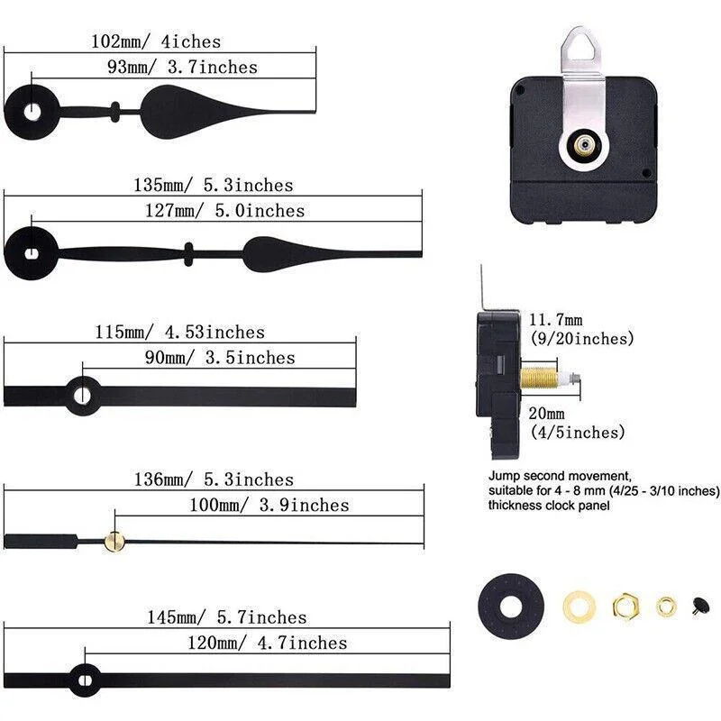 - High torque watch movement: Features an I-shaft clock with a metal hook designed to handle long clock hands (from 10mm to 450mm).