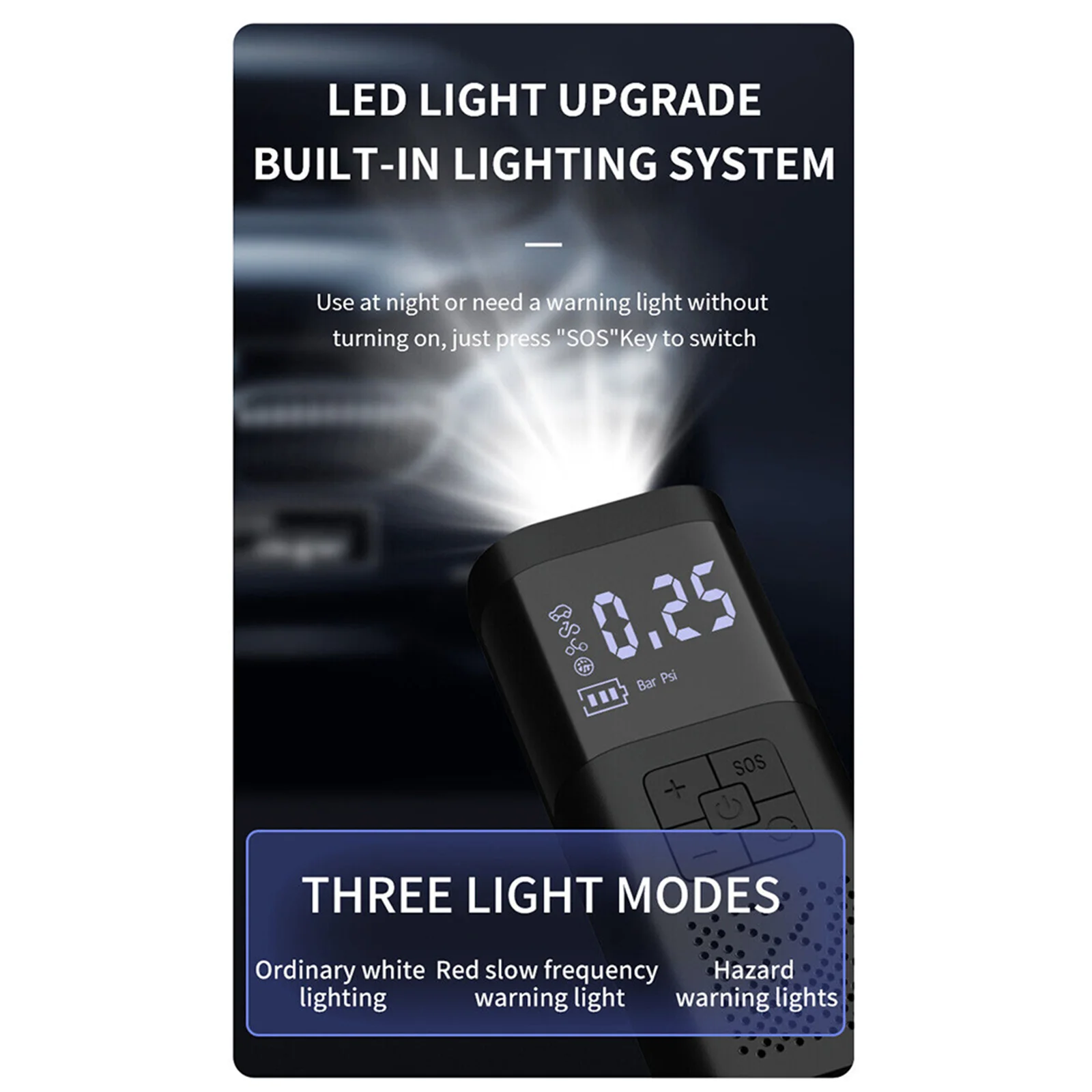 Multi-functional Car Air Pump With digital LCD display, you can easily see the pressure value.Once connection, the current tire pressure is displayed, so you can monitor accurate tire pressure at all times.The LED light can provide lighting, it helps you use in the night or dark. You can use the SOS light on the highway or emergency use to be seen quickly.