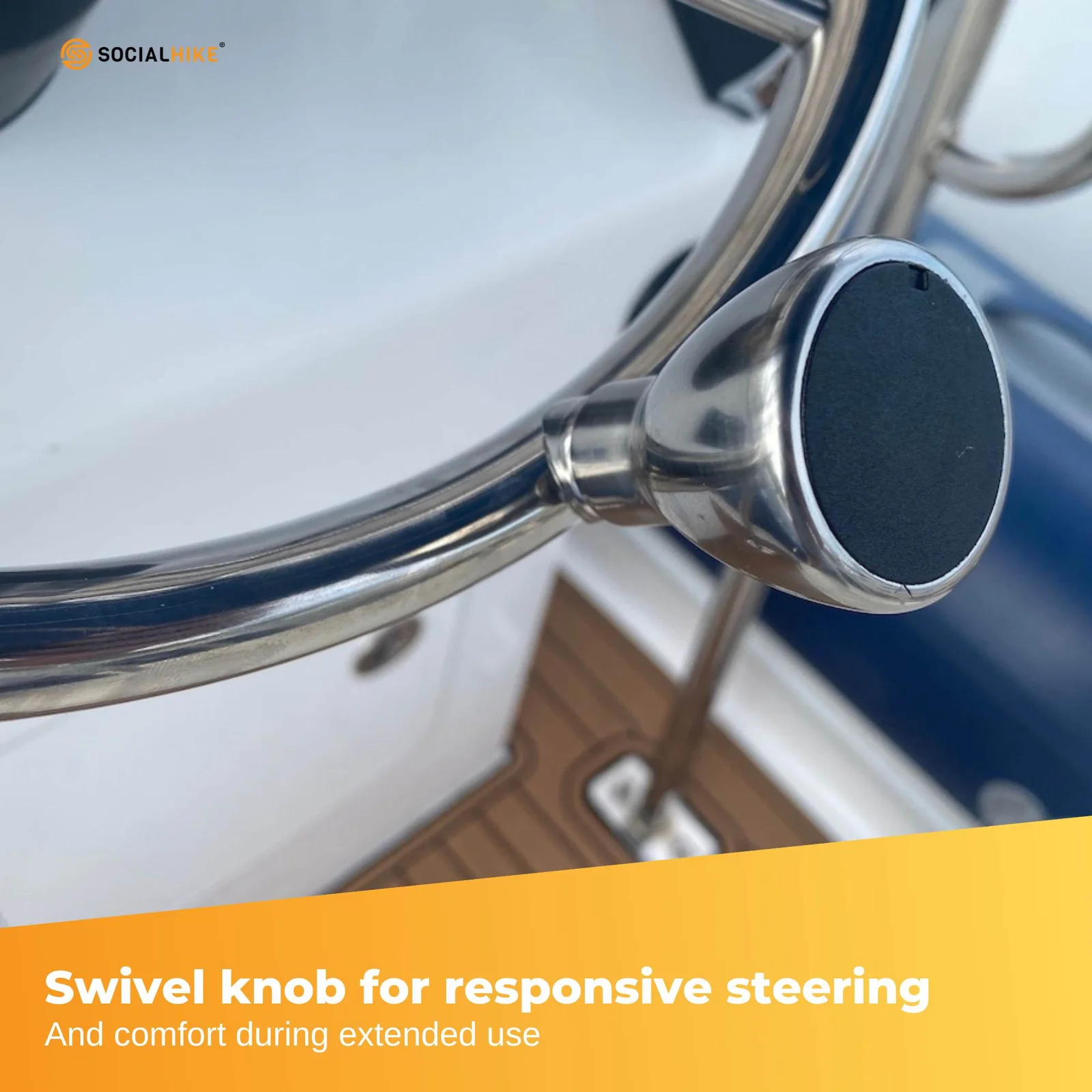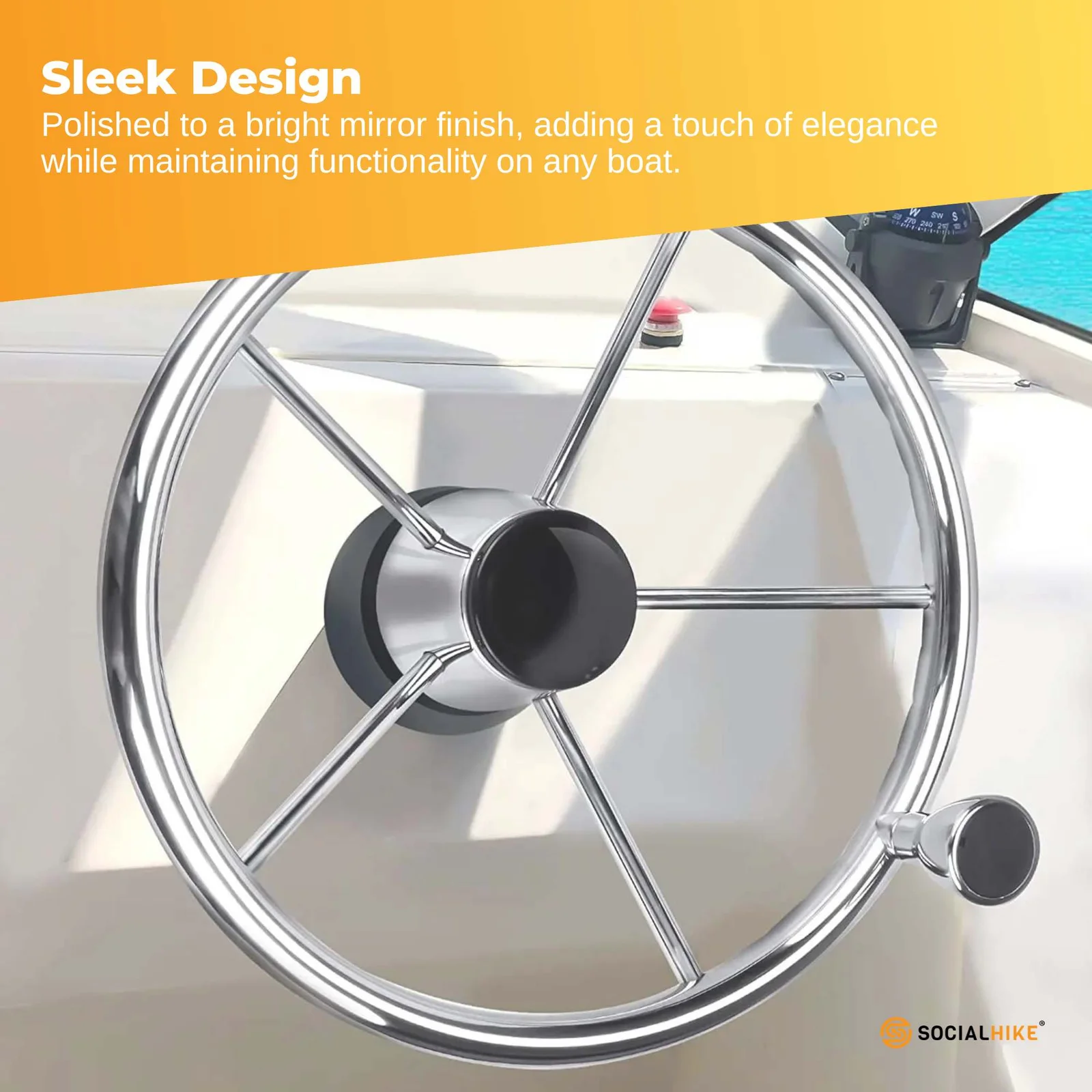 Crafted from solid 304 stainless steel, this destroyer style steering wheel combines durability with sleek design. Its polished mirror finish and ergonomic finger grip dents ensure comfort and control on the water. Its ergonomic design and assist knob provide quick and responsive steering, enhancing comfort and control. The in-built mounting hub fits a standard 3/4-inch tapered shaft. Easy installation, requiring no tools, makes it ideal for various boat types—from yachts to dinghies—offering reliable performance in harsh marine conditions.
