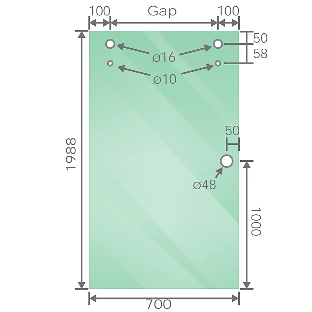 Tailored for a frameless shower screen featuring a sliding door, our product showcases 10mm clear toughened glass with 2mm radius corners and polished edges. All measurements are in millimeters, and the panels come pre-drilled to seamlessly fit various styles of shower hardware. They are adjustable to suit widths ranging from 1250mm to 1340mm.