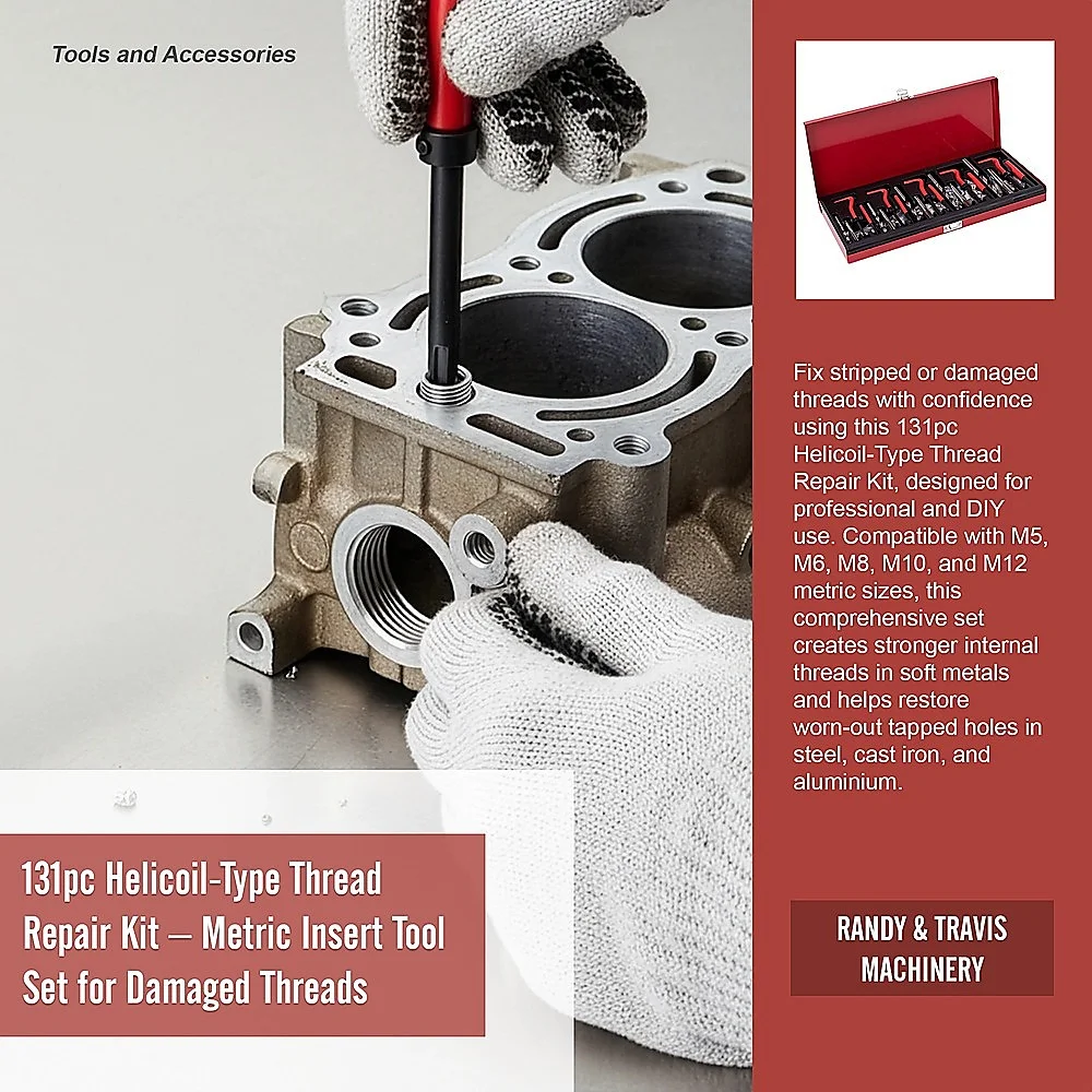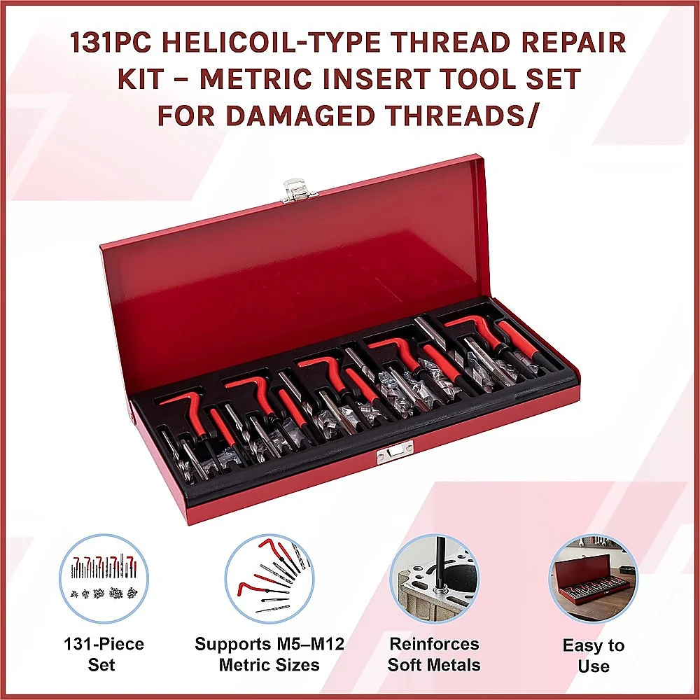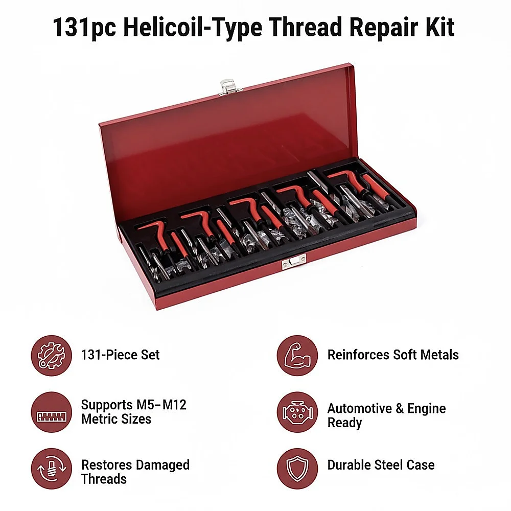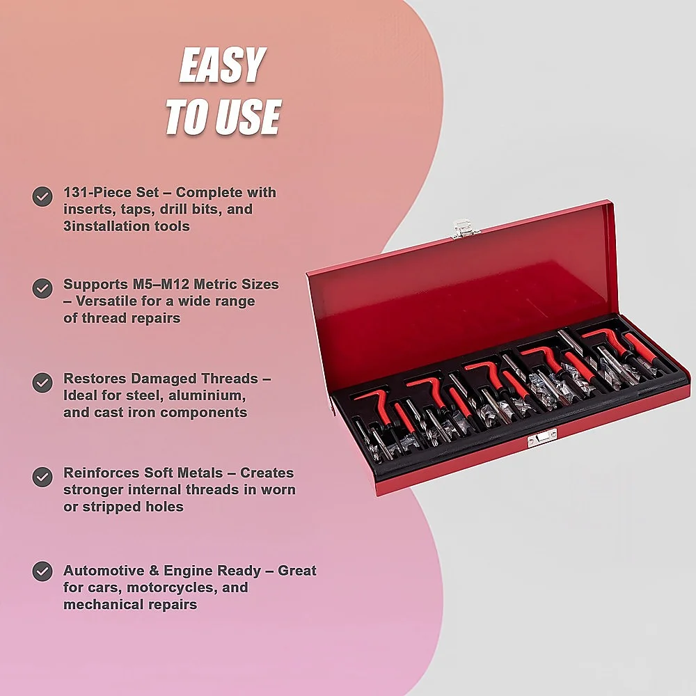 Fix stripped or damaged threads with confidence using this 131pc Helicoil-Type Thread Repair Kit, designed for professional and DIY use. Compatible with M5, M6, M8, M10, and M12 metric sizes, this comprehensive set creates stronger internal threads in soft metals and helps restore worn-out tapped holes in steel, cast iron, and aluminium.