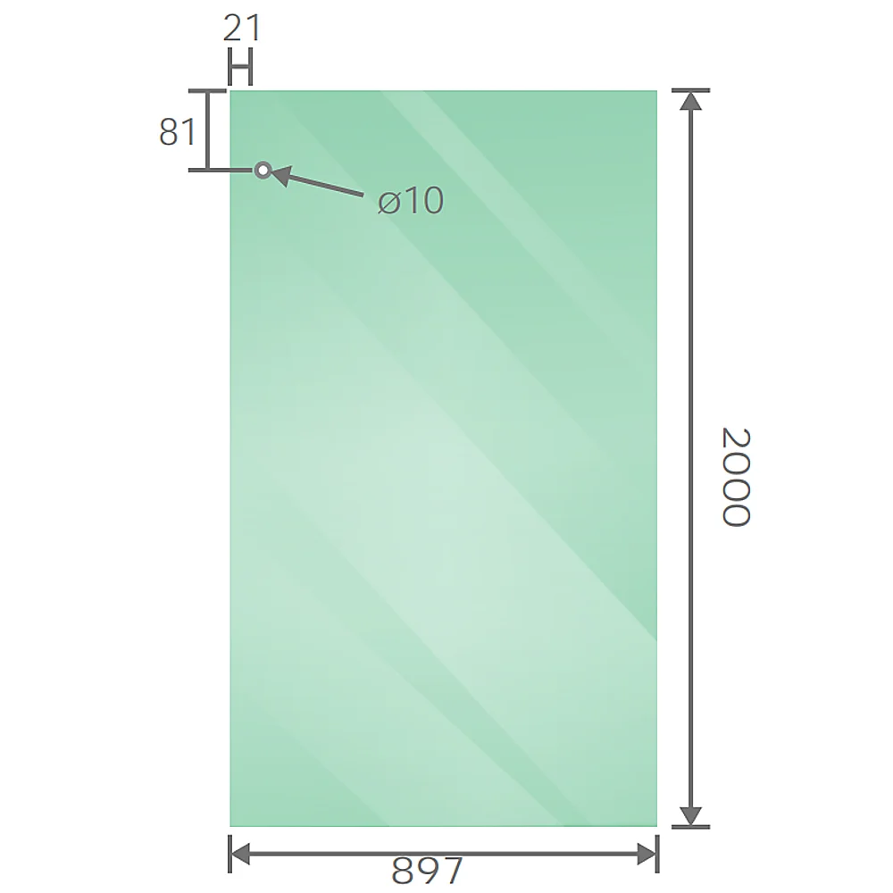 Tailored for a frameless shower screen featuring a sliding door, glass screen for the side panel showcases 10mm clear toughened glass with 2mm radius corners and polished edges. All measurements are in millimeters, and the panels come pre-drilled to seamlessly fit various styles of shower hardware.
