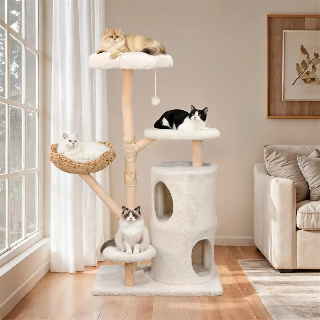 【Cat-friendly Cat Tree】Artfully designed in the shape of a tree, this indoor cat tower combines white accents with warm tones of natural wood, blending natural aesthetics with feline functionality, makes it a beautiful piece of furniture, the structure includes two plush-lined condos for private retreats, a cushion top perch for panoramic views, two platforms for jumping, and a rattan basket that adds textures and comfort, perfect for both single and multi-cat households, allows to climb, lounge, play simultaneously without disturbing one another