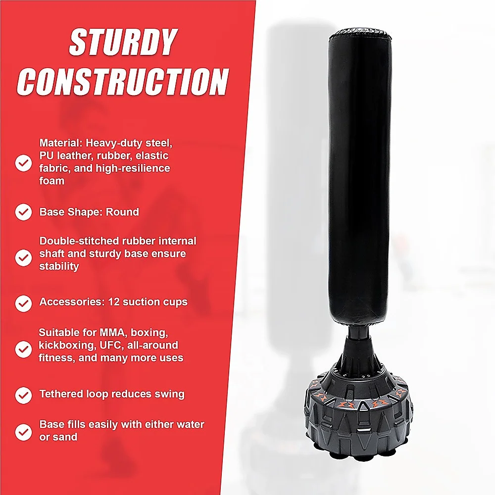 Crafted from heavy-duty steel with a double-stitched rubber shaft, the stand is built for extra stability. Twelve suction cups under the base prevent slippage and protect your floor. Fill the base with either sand or water and you're ready to train. Perfect for kickboxing, MMA, UFC, and standard boxing, this essential piece of equipment accommodates them all. Take your martial arts game to the next level when you train at home with this professional-quality punching bag and stand. Order yours today!