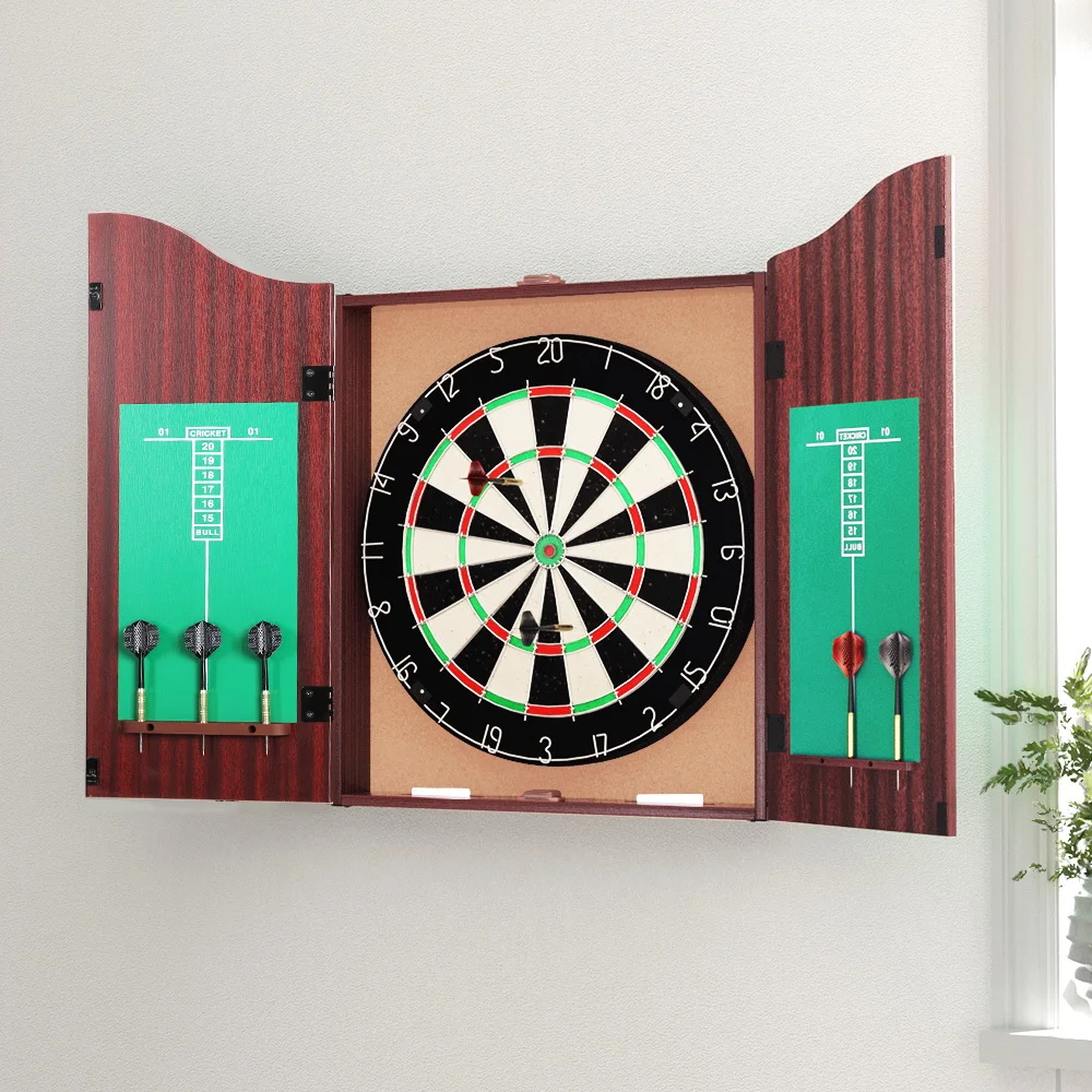 Get competitive at your next party or function with a classic Dartboard Cabinet. The dartboard is made from premium quality sisal fiber panels with a sturdy rotating score ring and features six heavy-duty darts for classic play, all stored in a practical and sophisticated dartboard cabinet. The board has unique features such as a staple-free divider to prevent bounce-out, an extended dart catchment area and protective rubber feet. The sisal fiber panels are self-healing and the scoring ring rotates to extend the life of your dartboard. The darts are made from stainless steel and feature a skid-resistant grain and flexible top, giving you more control over the flight path. The cabinet features a handy scoreboard, integrated dart storage, and a delightfully smooth exterior. The board is not only a fun game but its elegant design will suit any home or business. Easy to assemble with the included wall mount bracket and fixings, you’ll have plenty of fun with our sporty premium Dartboard.