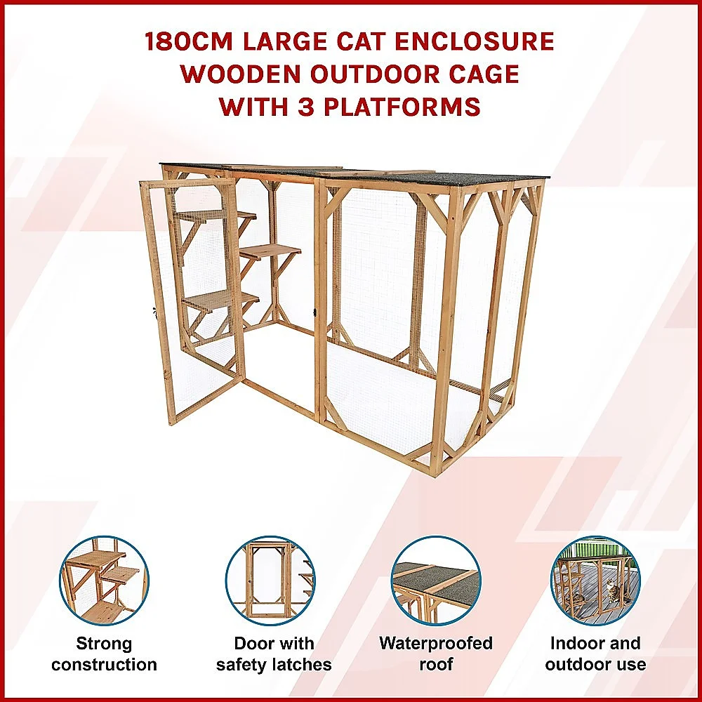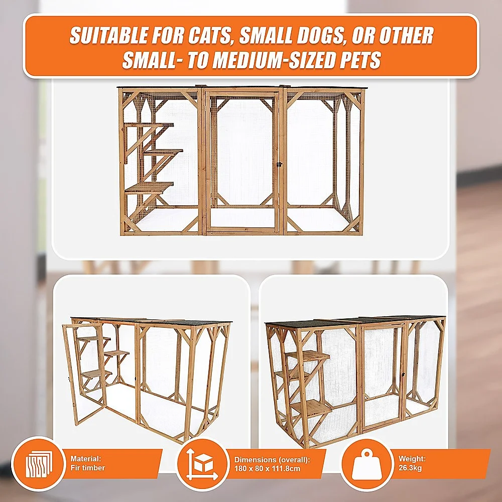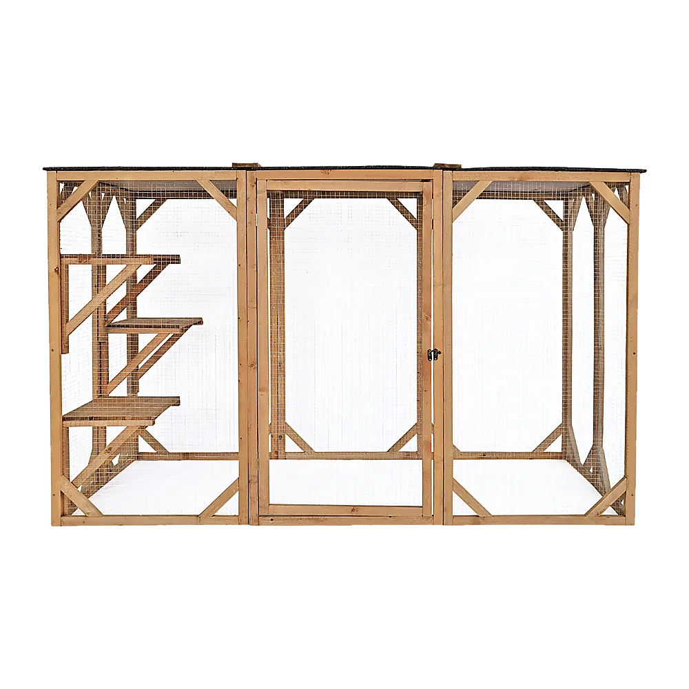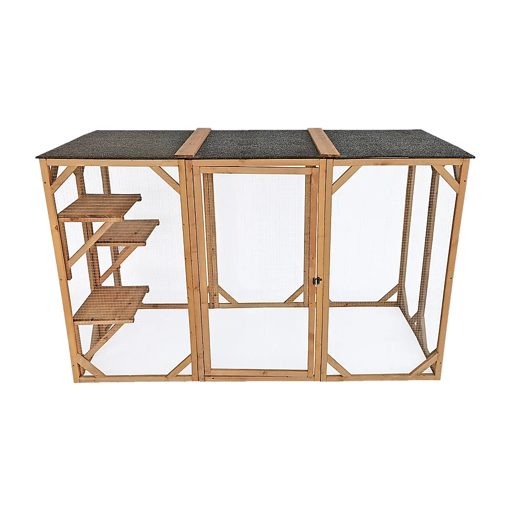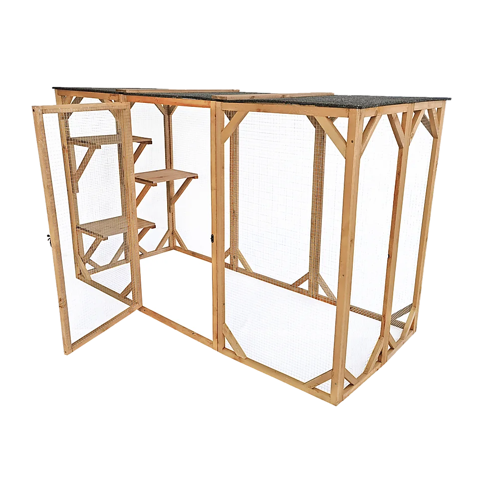 Have you ever wanted to allow your cats or small dogs to play outside but were afraid that they'd get out into traffic or fall victim to predators? With this completely enclosed playpen, you never have to worry about their safety. They'll enjoy the fresh air, sunshine, sights, and sounds of nature without the dangers of outdoor life. Crafted from natural fir timber and wrapped in metal wire, this sturdy patio-like enclosure will keep your pets safely inside. Three platforms provide the perfect perch for Kitty to relax and watch the world go by. Overhead, an asphalt-covered roof protects your pets from rain and the hot summer sun.