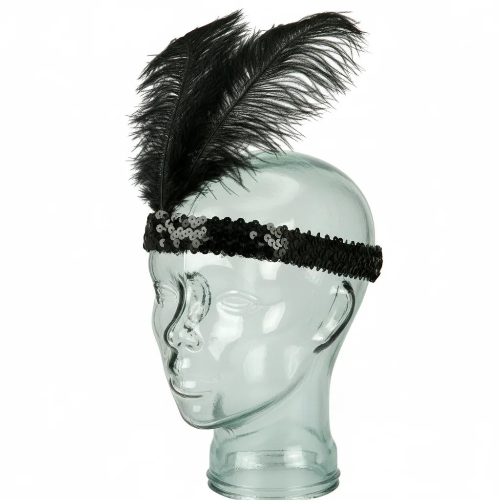 - Design: Sequin elastic band with jewel detail and ostrich feather accent.