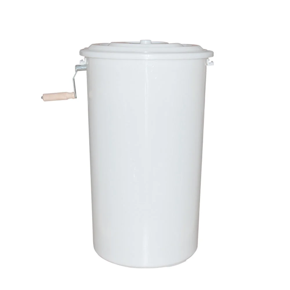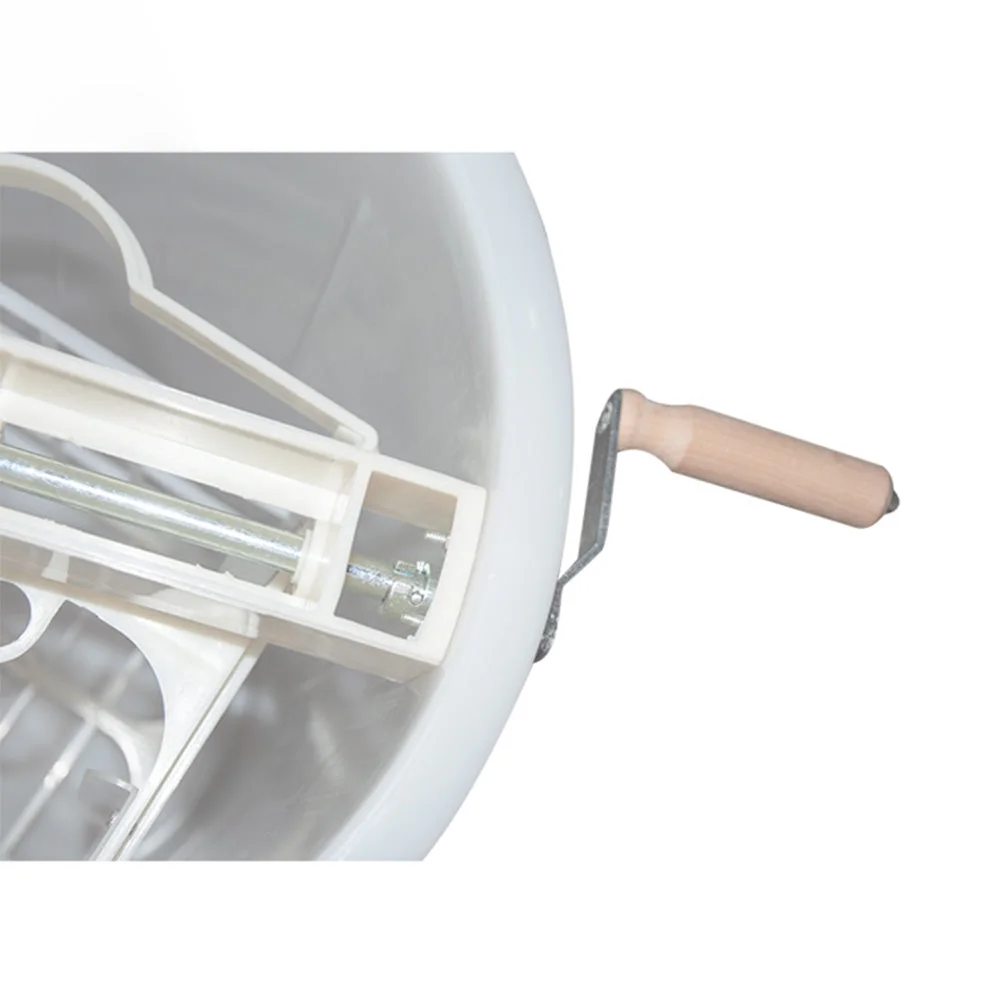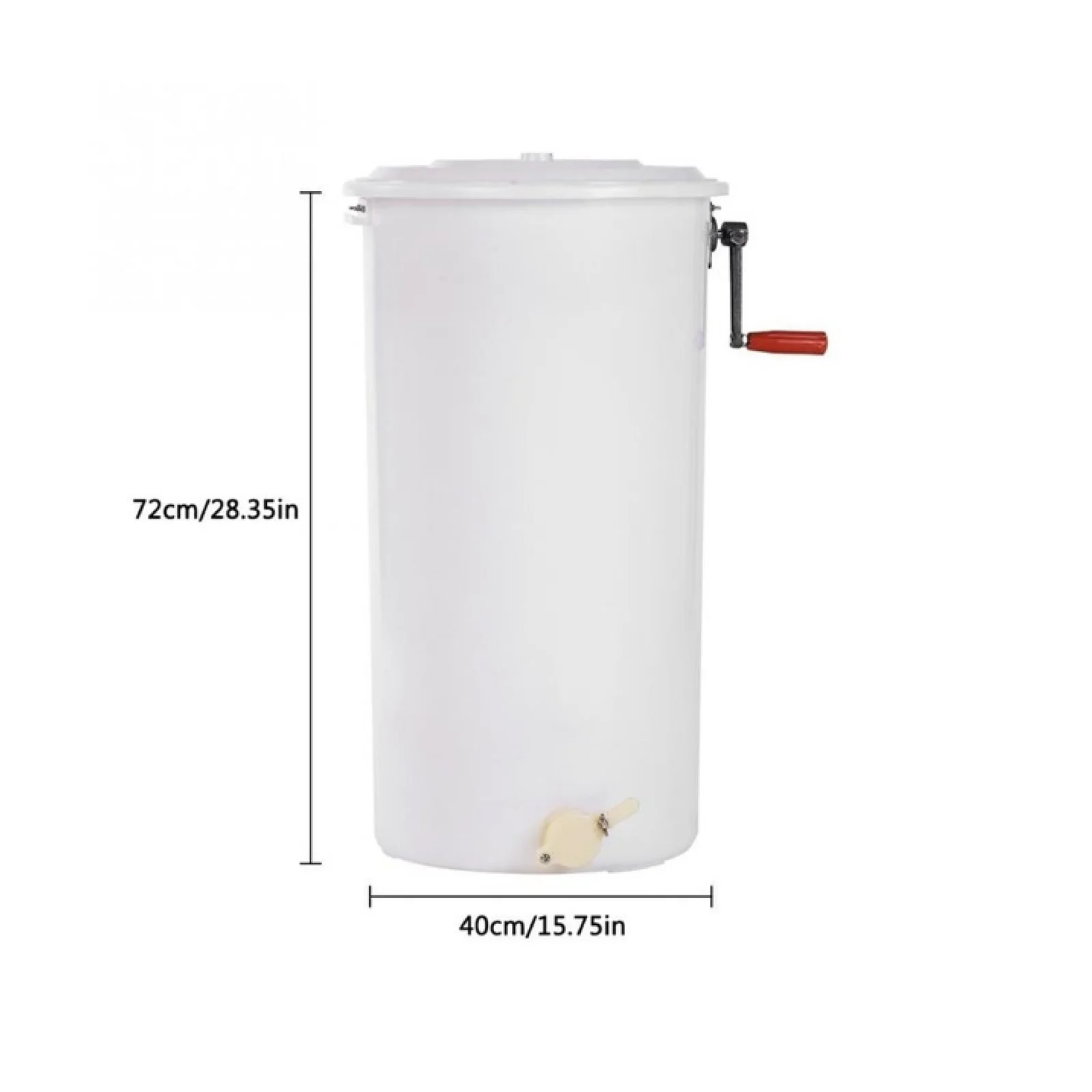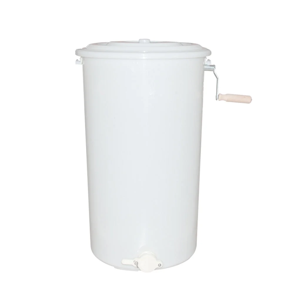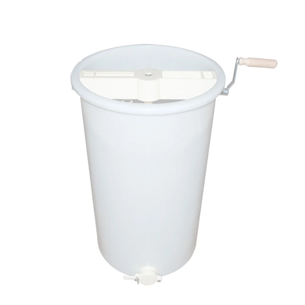 The hand-cranked model is constructed with a heavy food grade plastic, except for a steel centre shaft. It includes a plastic tank, cover and honey gate. Holds two frames of any size. The drum is 70cm tall with a 40cm diameter.