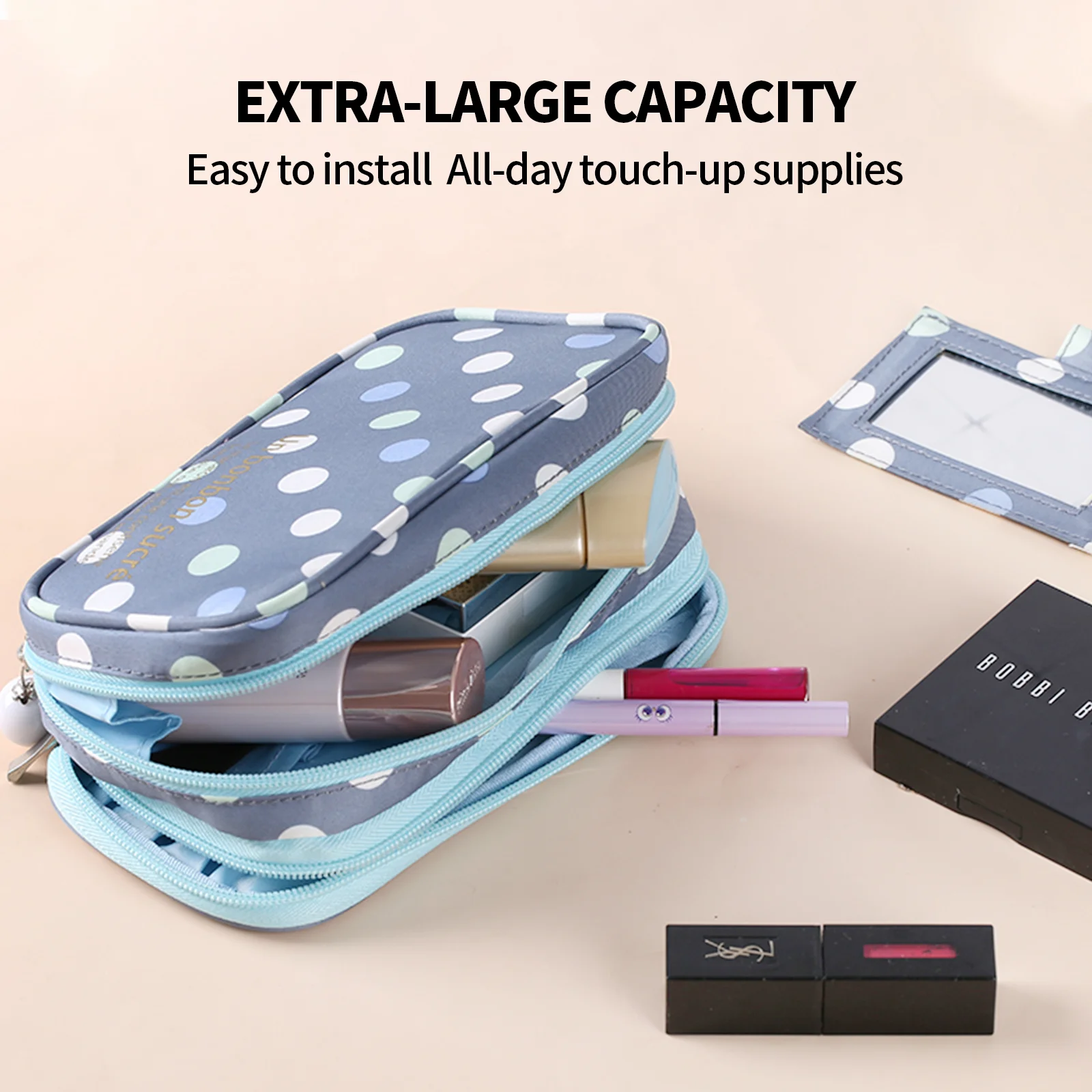 2 Layer Makeup Bag w/ Mirror Travel Cosmetic Bag Organizer Brush Slots Portable