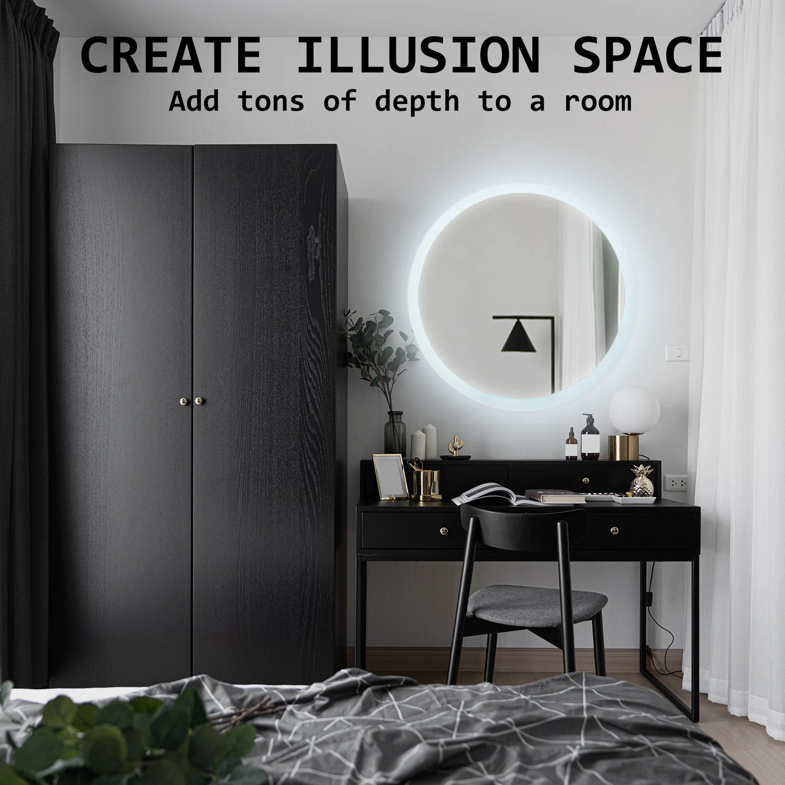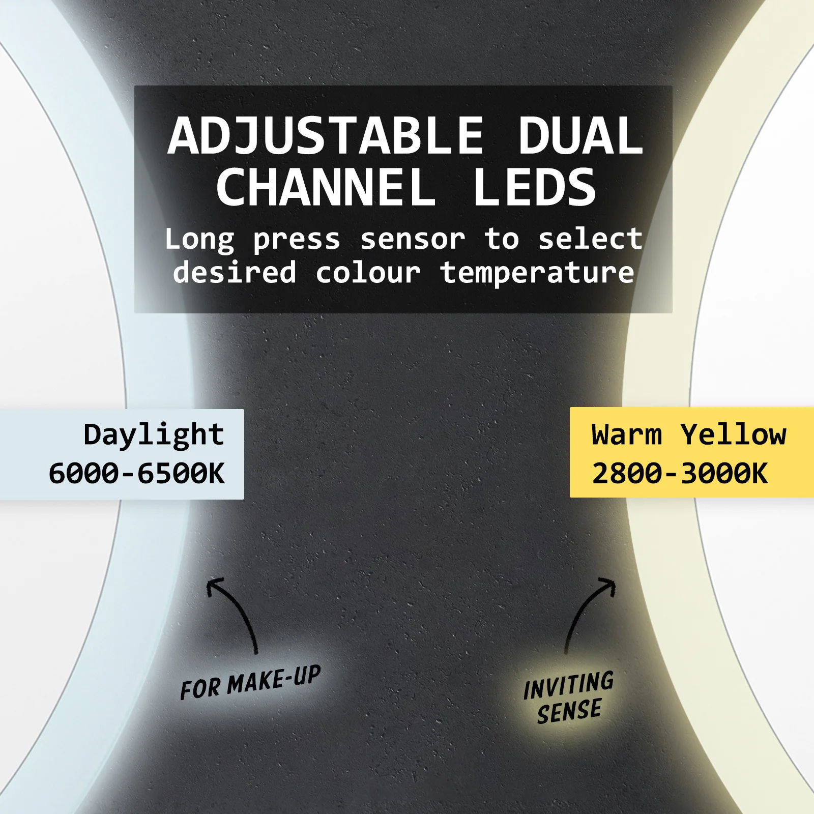 The LED round mirror is modern and clean in design comes with an energy-efficient LED light strip place around the mirror. This illuminated mirror besides saving more energy and cost than light bulbs but also has a long-lasting lifespan of up to 50,000 hours. Not to mention it combines dual-channel LEDs greatly affect aesthetics and ambience. You can adjust its colour temperature range from a mix of warm yellow and cool white LEDs and cross-dim between the two with a simple long touch.