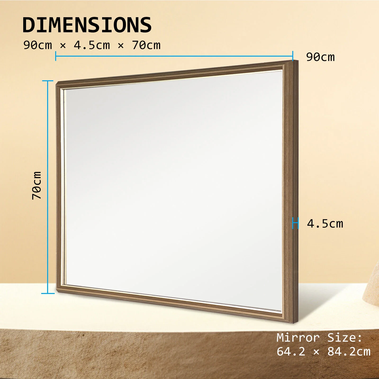 Brand: La Bella Shape: Rectangular Style: Minimalistic and mid-century modern chic Frame Material: PS Polymer, lacquer Mirror Material: Aluminium Mirror Position: Vertical and horizontal Frame Colour: Antique Brown Frame Thickness: 4.5cm Frame Width: 2.9cm Mirror Size: 84.2 x 64.2cm Overall Dimension (L x W x H): 90cm x 4.5cm x 70cm Weight: 6.3kg| Brand | La Bella |
