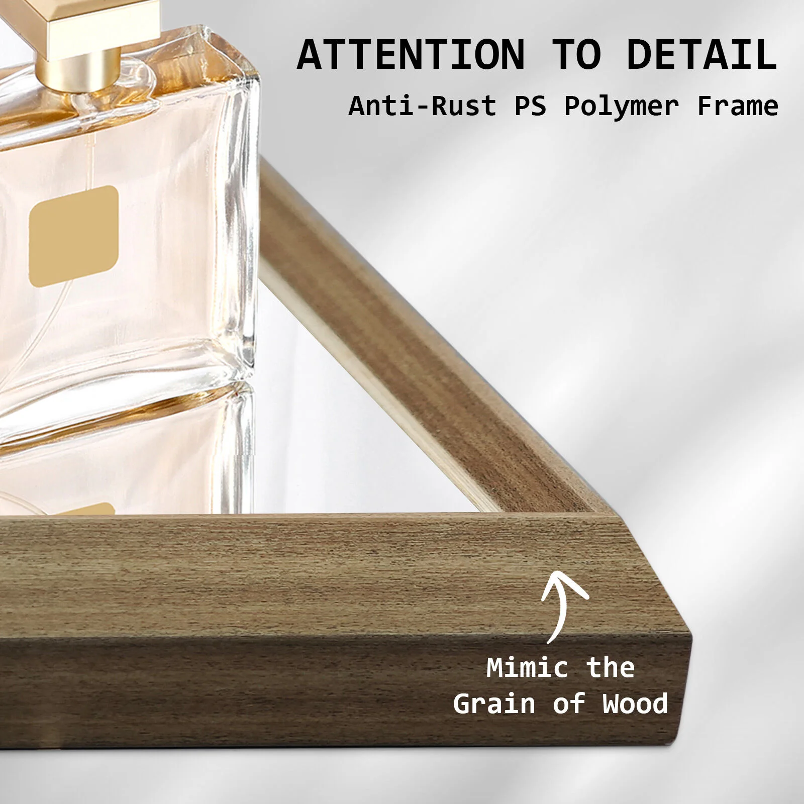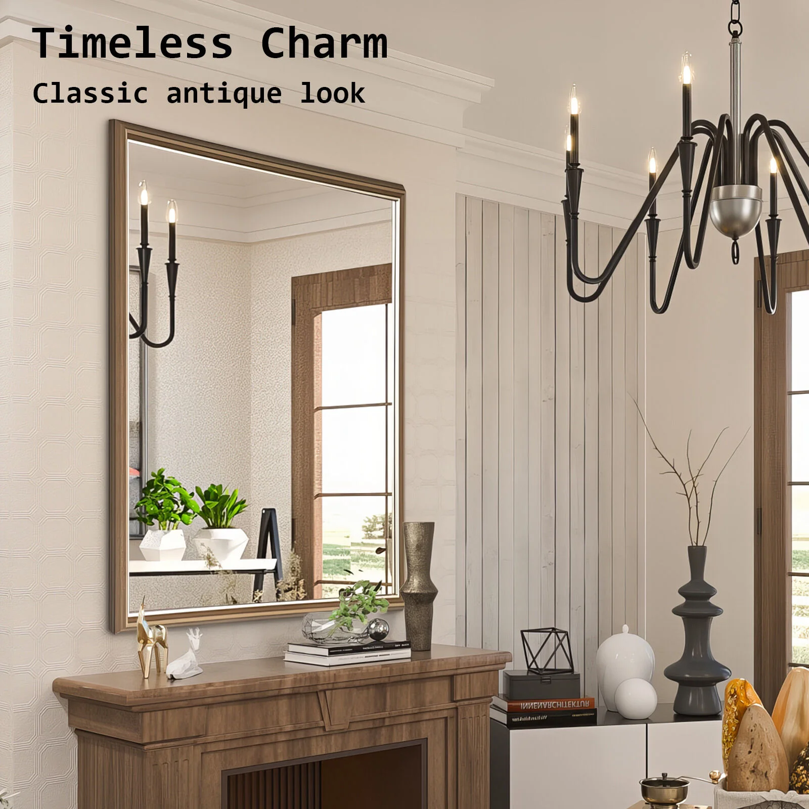 The mirror has a stylish and neat design, featuring a 4.5cm thick PS polymer frame with a finish that gives it an antique look. Additionally, its full-frame design creates a central focal point in any room, making spaces feel more inviting and relaxing.