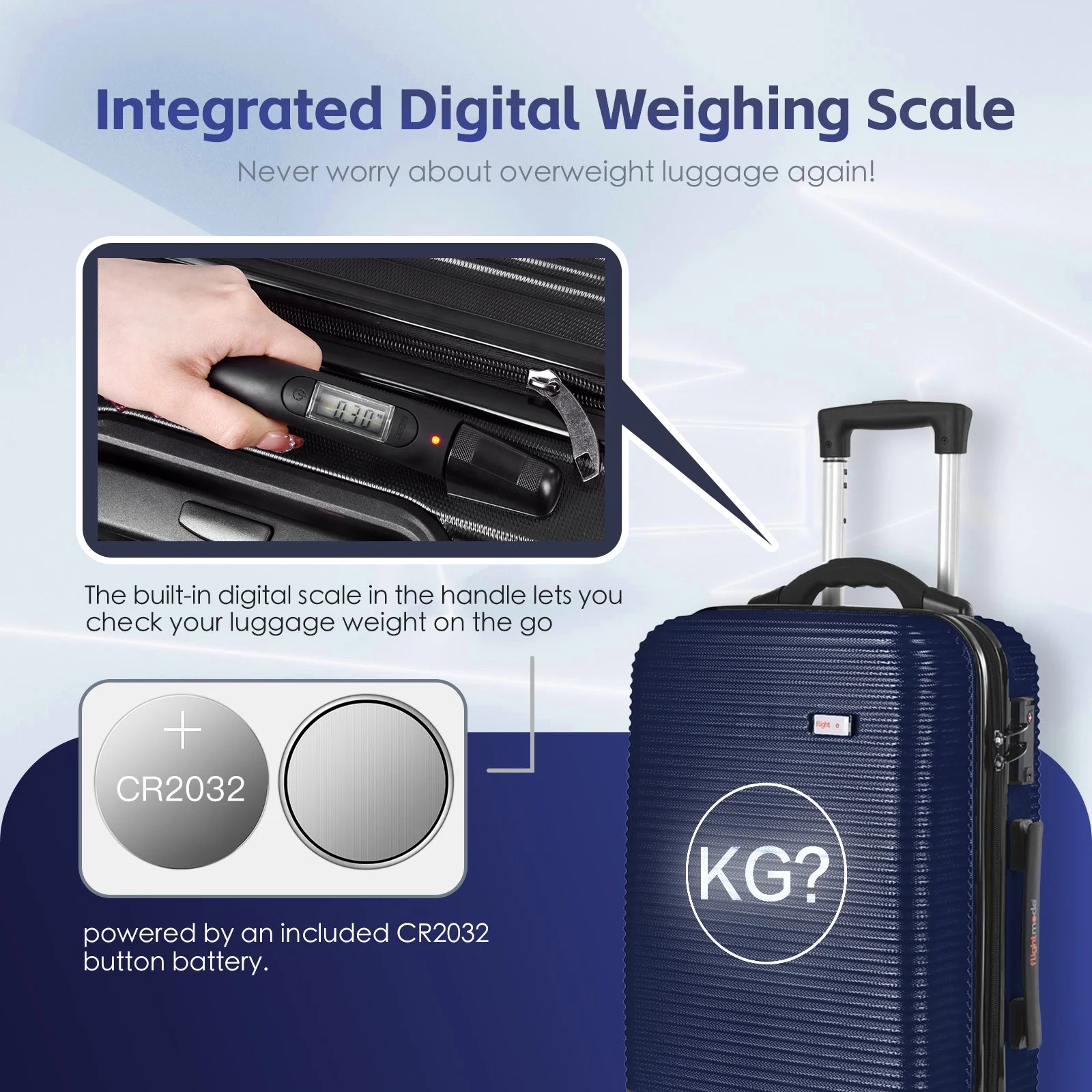 Integrated Digital Weighing Scale: Check your luggage weight on the go with the built-in digital scale in the handle. Powered by a CR2032 button battery (included).