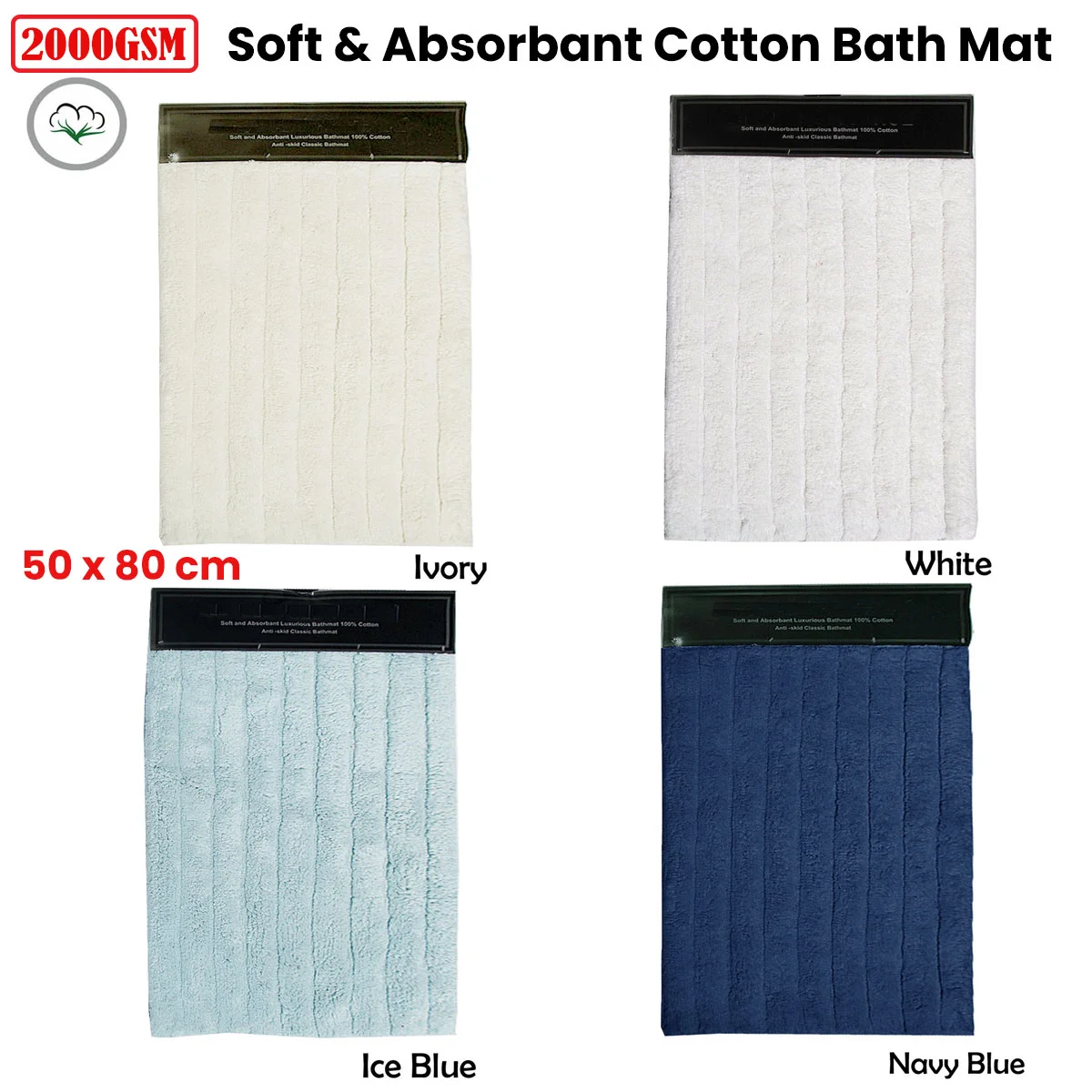 Add a decorative touch to your bathroom with this lovely 2000GSM Soft Absorbant 100% Cotton Bath Mat 50 x 80cm. Bath mats help keep the floor dry and safe. This bath mat features solid colour design in soft neutral hues that is a great way to spruce up you bathroom space instantly. It is made from soft and absorbent 100% Cotton fabric with easy care properties and long lasting quality.