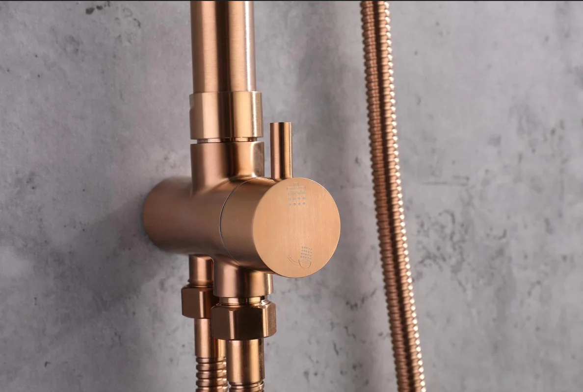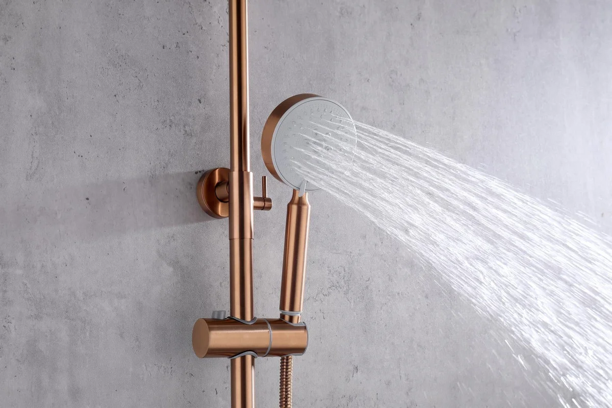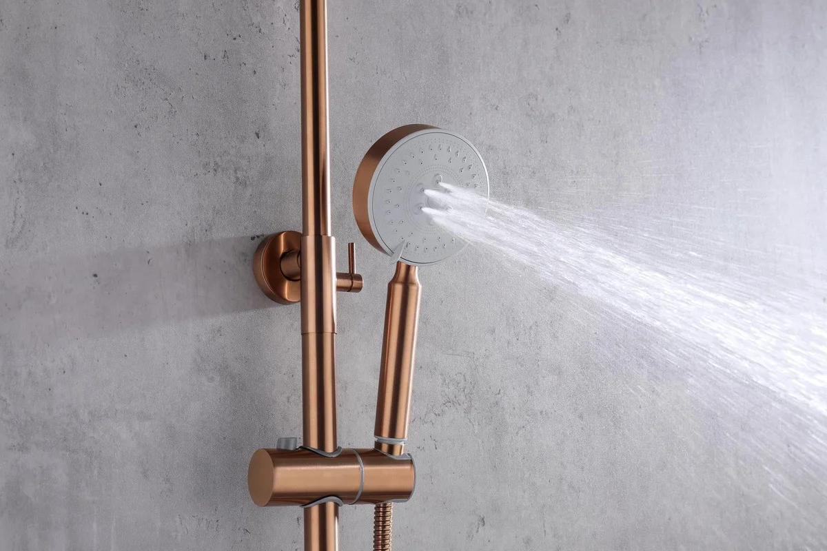 Includes: 1: Solid Stainless steel overhead, head 200 mm with hand-held shower head with multi-function, 1.5-meter hose, and integrated diverter Brushed Rose Gold Copper Color 2: Inlet elbow with a flexible hose, so you can put the inlet socket anywhere, easy to install and retrofit. 3:wall mixer not included Latest and trendy Burnished Brass gold/ brushed rose gold / matte black/gunmetal finish are also avaliable. This listing is for Brushed Copper shower head Model Name: JD-H89WELS Registration Number: S09988WELS 3 Star 8.5 L /Min