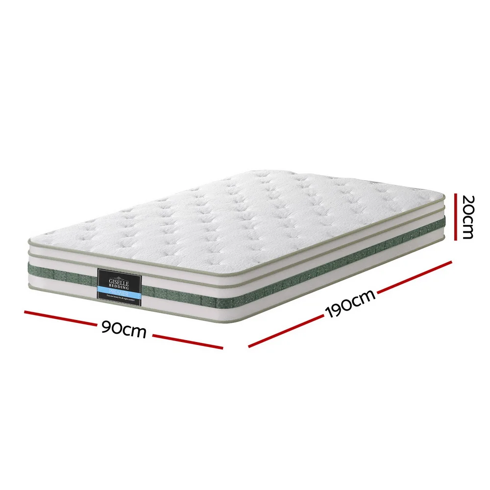 The Giselle Bedding Mint Series Mattress combines natural freshness with responsive support. Green tea foam helps maintain a fresher sleep environment, while the Euro Top layer cushions pressure points. Its 20cm profile features high-compression pocket springs and 6-turn coils that adapt to your body shape without losing firmness. Reinforced edges provide stable sleeping space, and the breathable bamboo fabric cover promotes airflow for temperature control. Available in 5 sizes (Single to King), it's engineered for lasting comfort in warm climates.