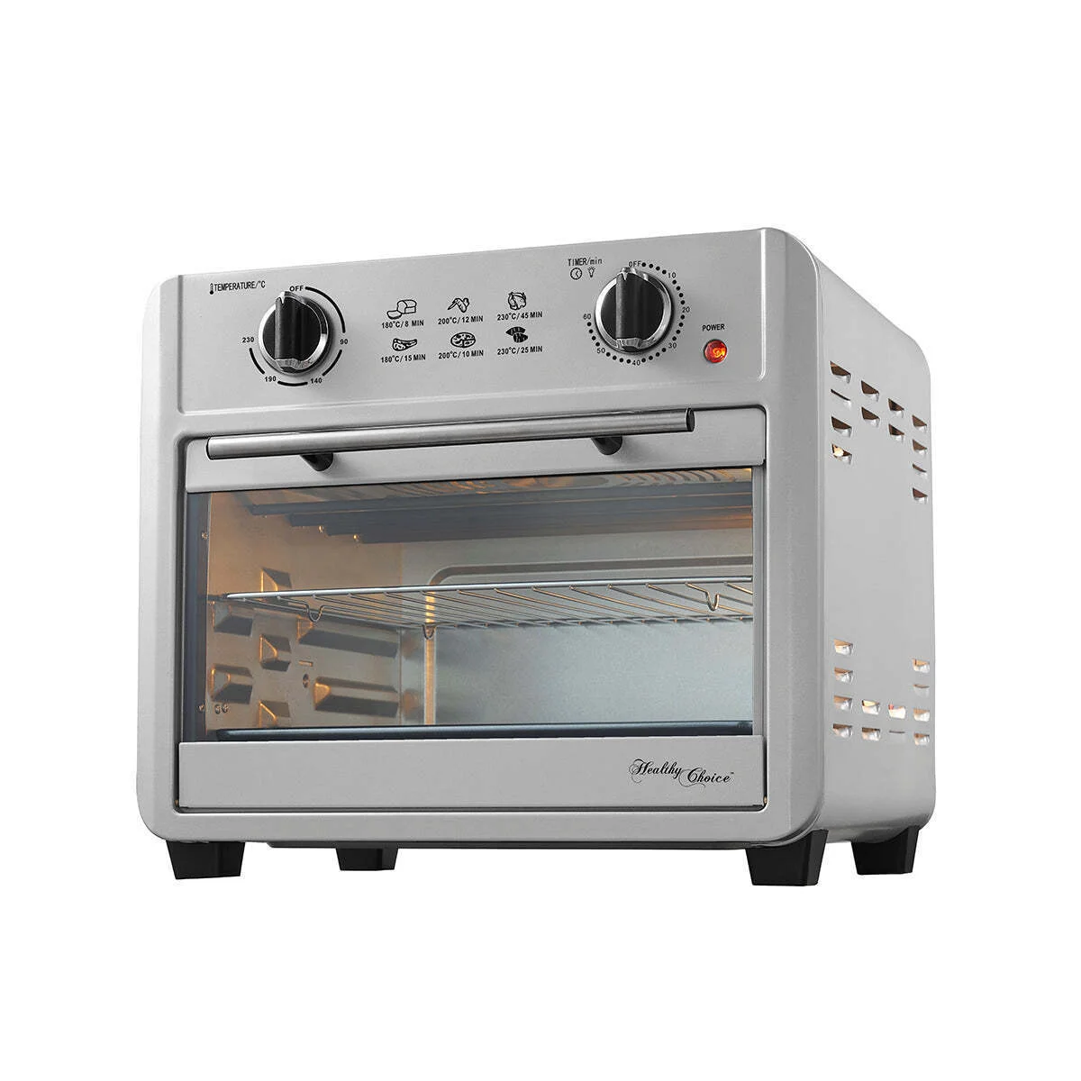 Better yet, this cutting-edge, circulating 'turbo air' technology with four stainless steel heating elements on the top cooks your food quickly with minimum oil, while still providing maximum taste. Simply add your ingredients into its huge, family-size 23 litre capacity and wait as the air fryer oven circulates 'superheated' air up to 230°C. Watch as your food toasts, bakes, broils, roasts, defrosts or 'air frys' its way to perfection behind the secure, glass viewing window. The built-in oven light helps you see the cooking progress without opening the air fryer oven door and letting the heat out.