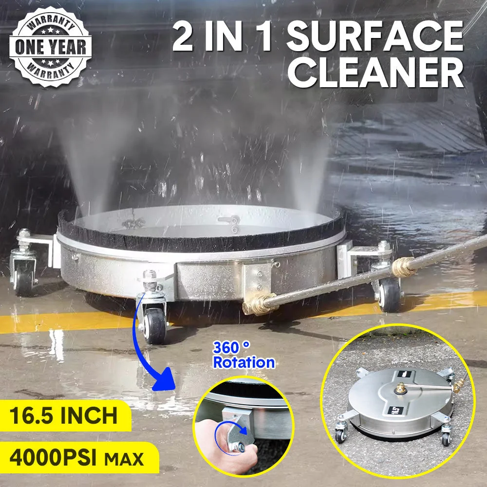 Introducing our 16.5'' High-Pressure Surface Cleaner,compatible with most pressure washers with maximum pressure of 4000 PSI and maximum flow rate of 4 GPM.With dual high-pressure nozzles,tough bristles and 4 castors it can effectively removes dirt with great mobility.Ideal for various flat surfaces and undercarriage.