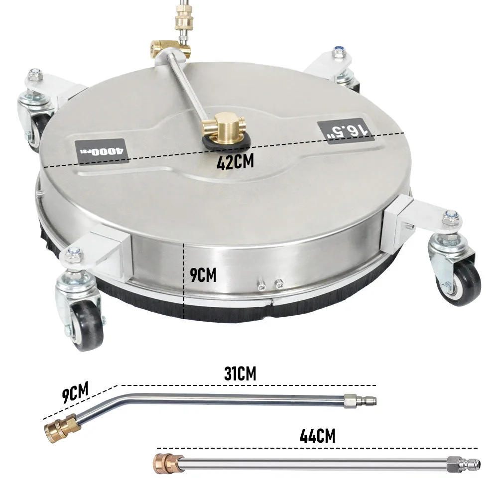 This 16.5'' high-pressure surface cleaner is a versatile cleaning for efficient cleaning for all horizontal surfaces and undercarriage.With stainless steel durable build,it's user-friendly and compatible with most pressure washers with a maximum pressure of 4000 PSI and a maximum flow rate of 4 GPM.