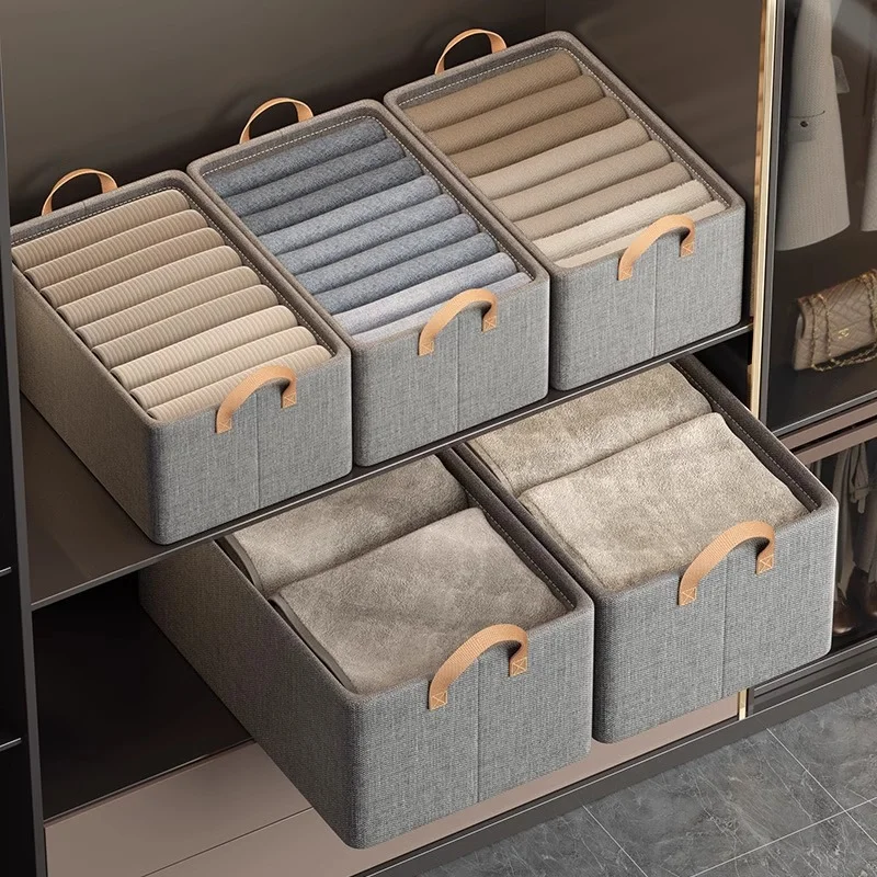Declutter and organize your space with our versatile Foldable Fabric Storage Bin. This 26L organizer is perfect for storing clothes, trousers, sweaters, and more in your closet, wardrobe, or on shelves. It features a robust five-layer fabric construction, including a durable cationic fabric exterior, dual nano waterproof layers, and a thickened density board core for enhanced structure. The internal 4mm galvanized steel frame provides solid, stable support, ensuring the bin remains rigid and does not collapse, allowing for secure stacking to save space. When not in use, the frame folds down for compact storage. With convenient, widened handles, this skin-friendly and odorless bin makes organizing your personal items simple and stylish.