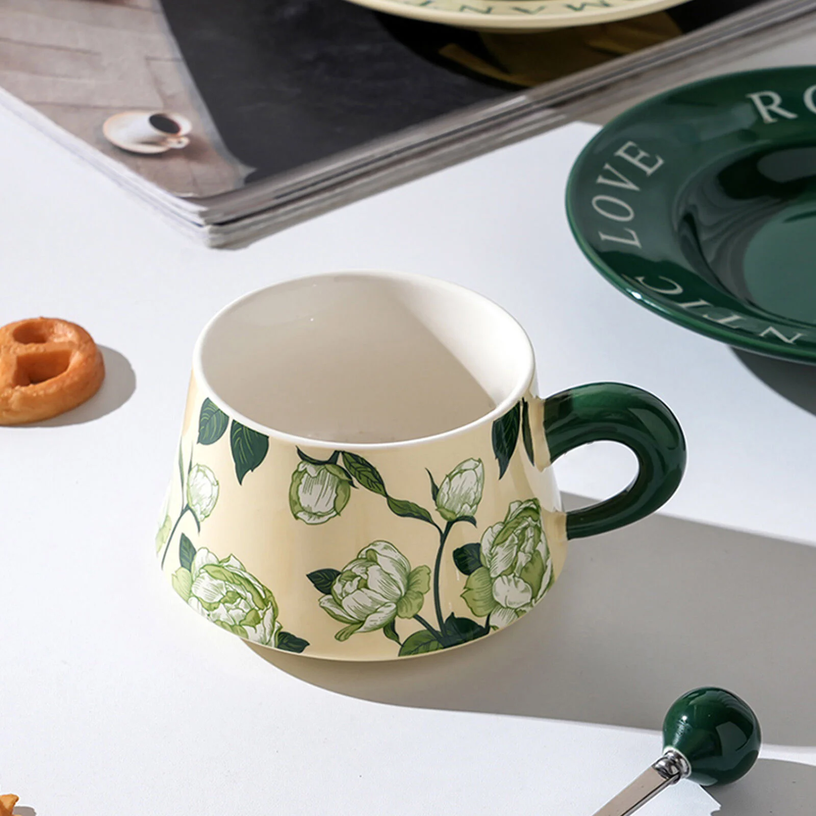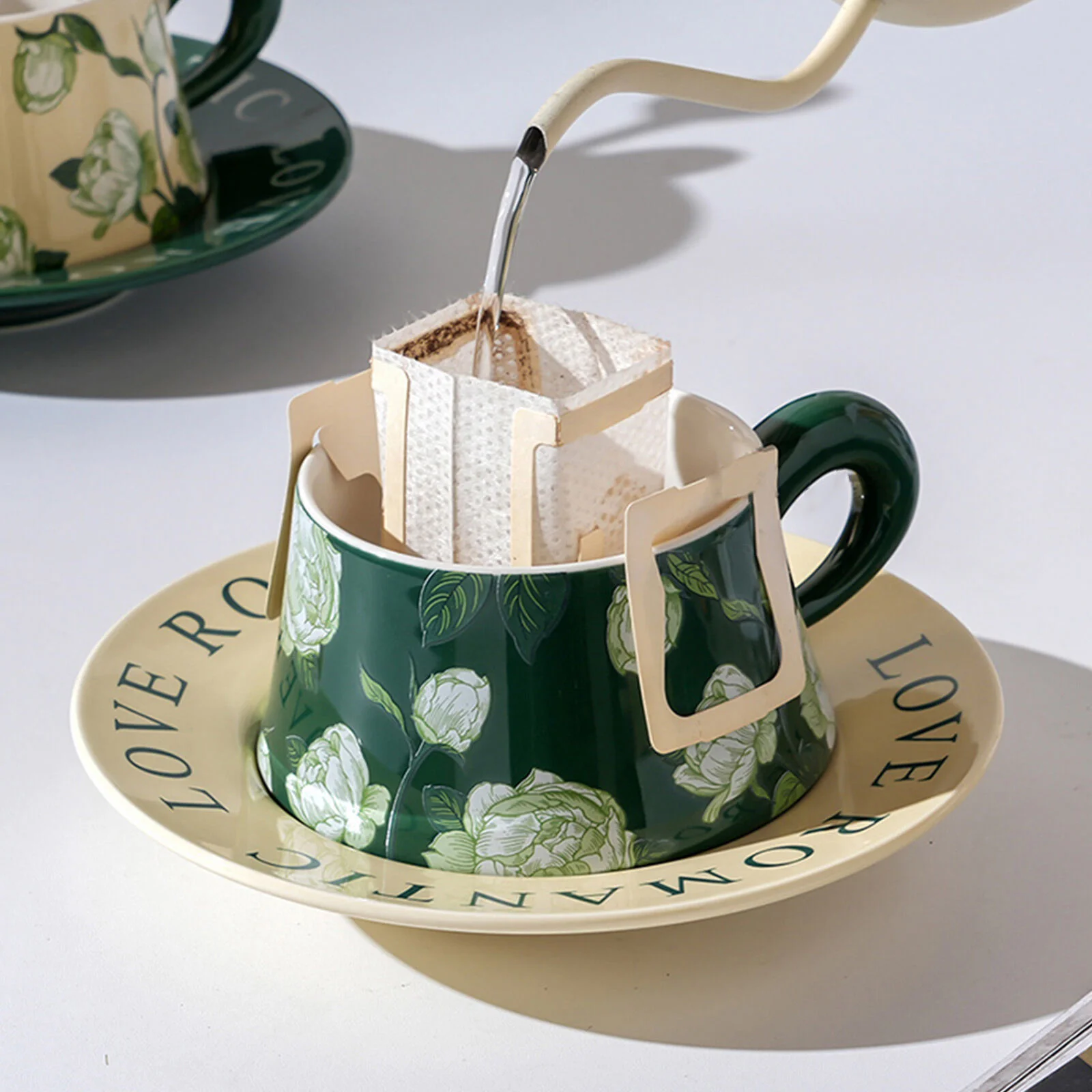 2 Set High-Fired Ceramic Porcelain Cup & Saucer Set with Tea Spoon Vintage Floral 300ml Green