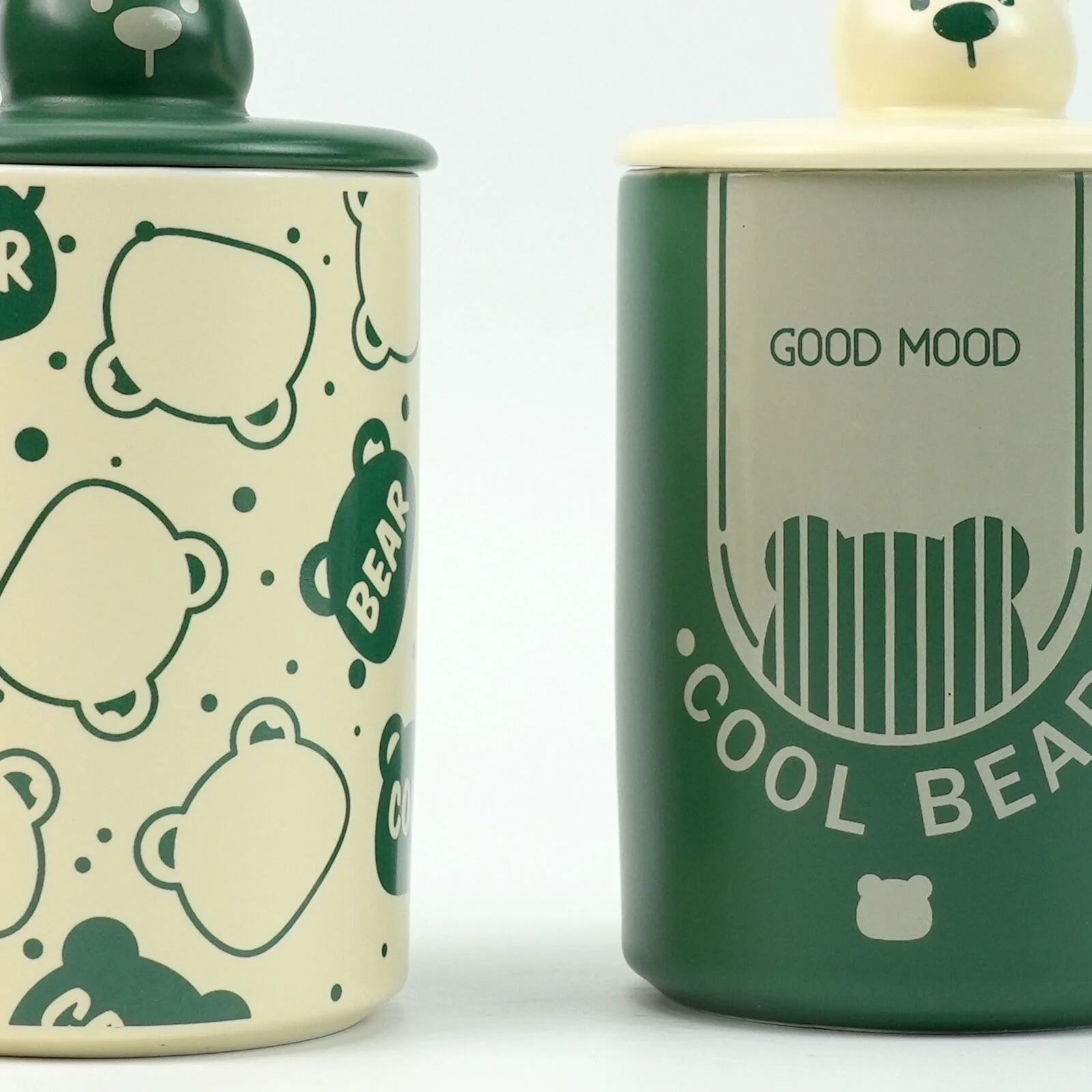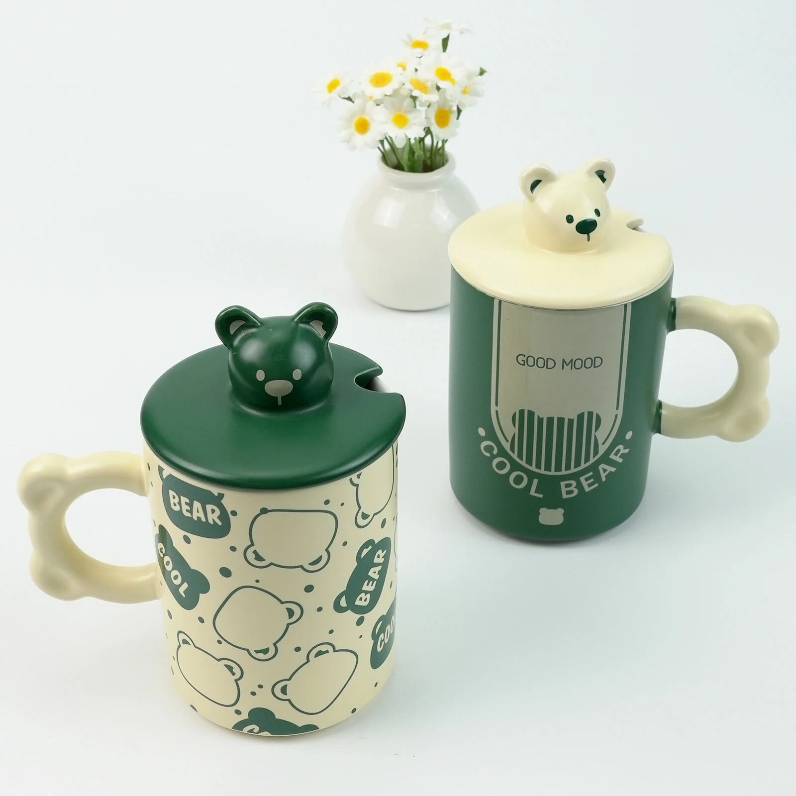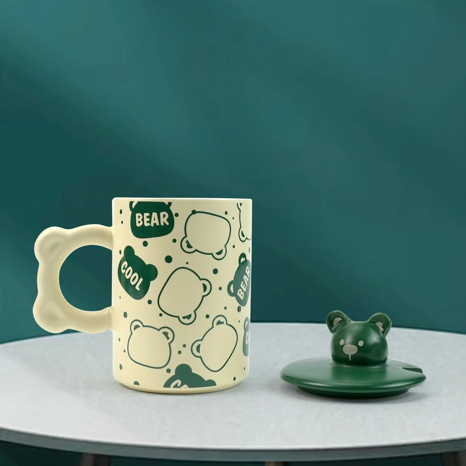 2 Set High-Fired Ceramic Porcelain Mug Set with Lid Bear Tea Spoon 400ml Green