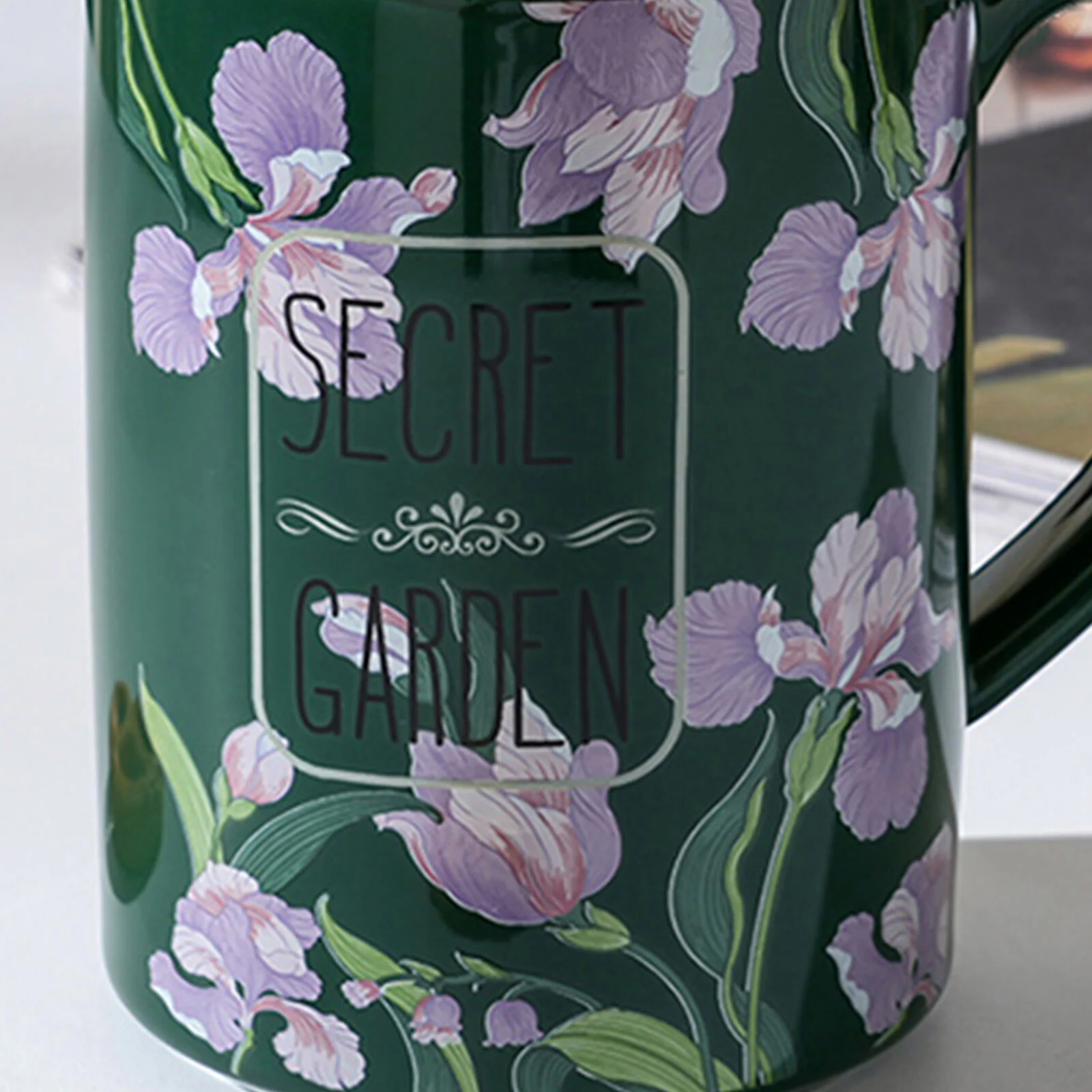 2 Set High-Fired Ceramic Porcelain Mug Set with Lid Tea Spoon Vintage Floral 400ml Green
