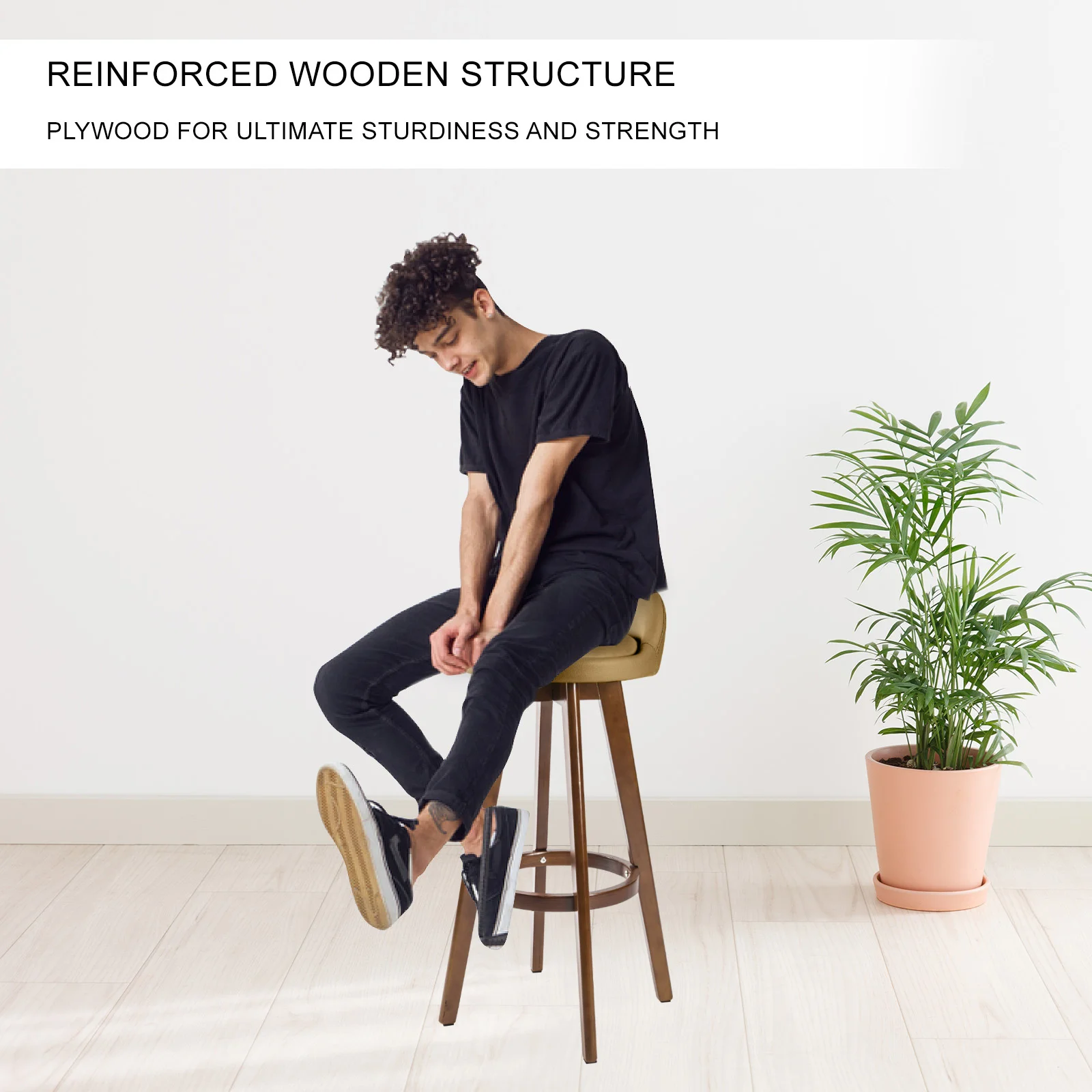 To ensure safety, the legs are tapered outwards to form a slight A-shape, so that the bar stool is well-balanced without occupying too much space. Additionally, the legs are made of solid plywood with a circular footrest to ensure extra sturdiness and support. This does not mean comfort is sacrificed as the seat itself is upholstered with PVC leather padding. Installed with a swivel mount plate, the seat will swivel 360 so that you can reach whatever you want, maximising accessibility. Stool legs are also equipped with anti-slip protectors to minimise scratches onto wooden and tile floors. To give you a peace of mind, the bar stool will only take you approximately 9 minutes to assemble.