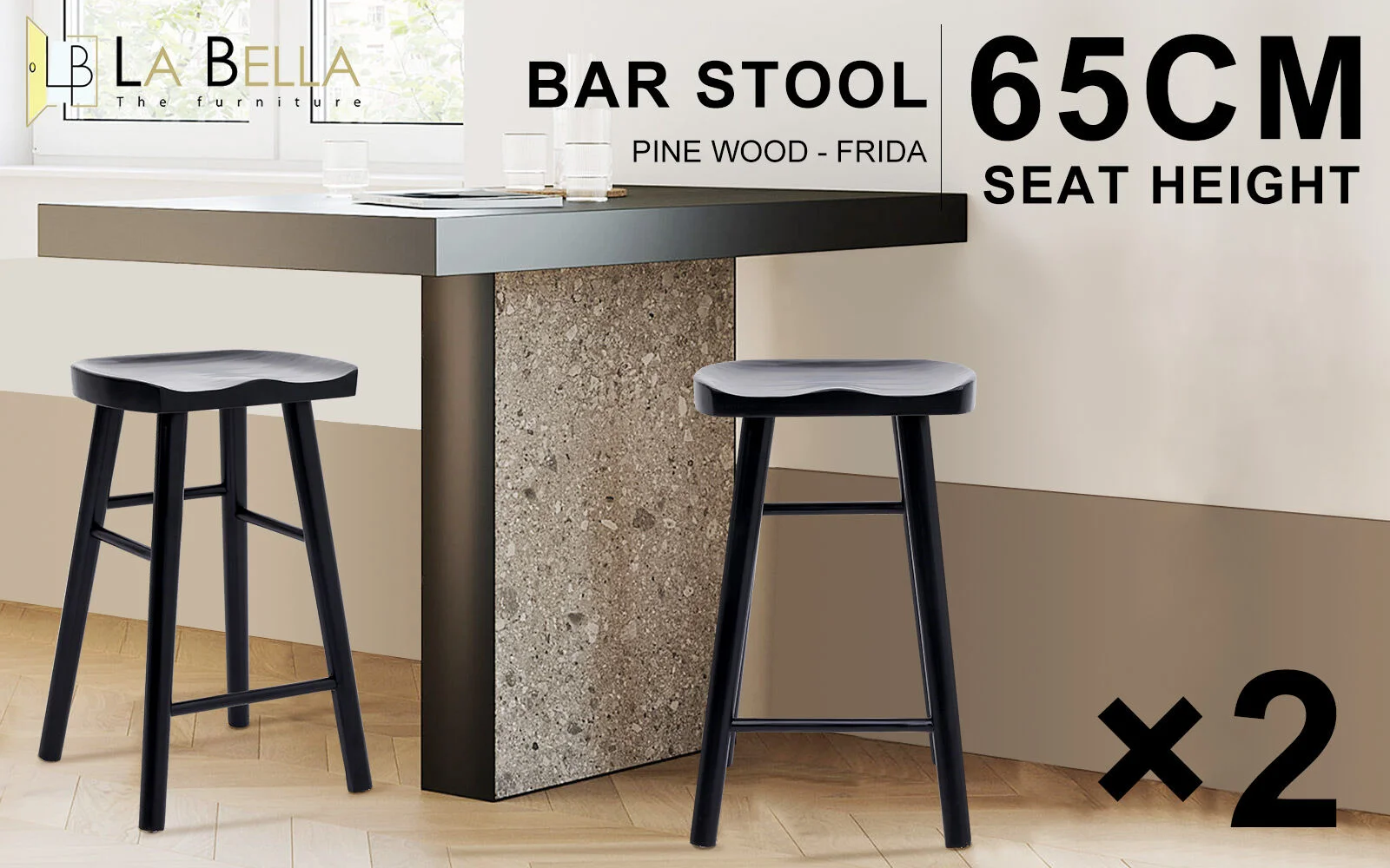 La Bella 2 Set Wooden Bar Stool 65cm FRIDA Pine Wood Counter Kitchen Barstools Cafe Dining Chair - Black
