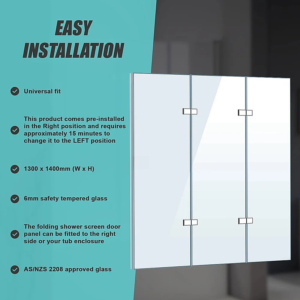 Our three-fold chrome bath shower door panel will brighten your existing bathroom or be a welcome improvement as a part of your bathroom renovation. This folding shower screen is a plus for both the homeowner and the home developer. The panel's frame is constructed of AS/NZS 2208 approved glass ensures safety and reliability.