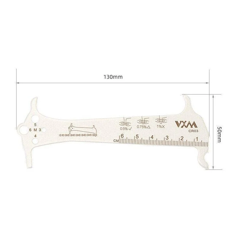 Keep your drivetrain in top condition with this 3-in-1 bike chain wear checker tool. Designed for cyclists who demand accuracy and durability, this compact multi-functional tool helps you measure chain wear, hold chains in place during maintenance, and check bolt sizes and lengths. Made from laser-etched stainless steel, it offers long-lasting readability and corrosion resistance. The three-step wear scale (0.5%, 0.75%, 1%) allows you to identify when your chain is approaching or exceeding its wear limit, helping prevent costly damage to your cassette and chainrings. Whether you're a mountain biker, road cyclist, or bike mechanic, this lightweight chain gauge is an essential addition to your toolkit.