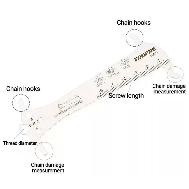 Chain wear indicator with 0.5%, 0.75%, and 1% scales to assess elongation accurately
